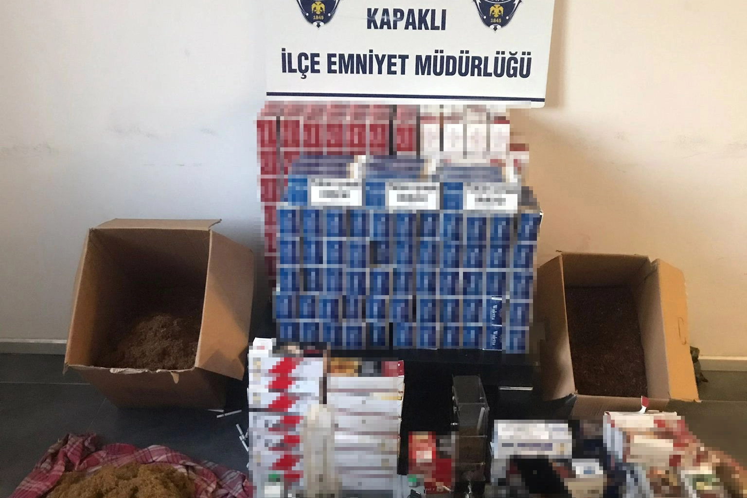 Kapaklı İlçe Emniyet Müdürlüğü ekipleri tarafından belirlenen ikamet aramasında, 2 adet elektrikli sigara sarım aleti, 12 adet manuel sigara sarım aleti, 10.5 kilogram kıyılmış tütün, 8 karton dolu makaron, 166 karton boş makaron ele geçirildi. Arama yapılan ikametin sahibi olan R.K. isimli şahıs polis ekipleri tarafından yakalanırken, olay ile ilgili tahkikat başlatıldı.