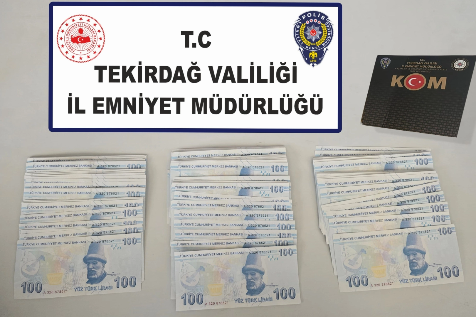 Tekirdağ İl Emniyet Müdürlüğü Kaçakçılık ve Organize Suçlarla Mücadele Şube Müdürlüğü ekipleri, 20 Eylül 2024 tarihinde Muratlı ilçesinde bir esnafa sahte 100 TL verildiği bilgisini aldı. Şüphelilerin araçla ilçeden ayrıldıkları tespit edilince, bahse konu araç Çorlu'da durduruldu. Araçta yapılan aramada, sahte olduğu değerlendirilen 23 bin TL (230 adet 100 TL) ele geçirildi. Olayla ilgili olarak, üç şüpheli hakkında parada sahtecilik suçundan yasal işlem başlatıldı.