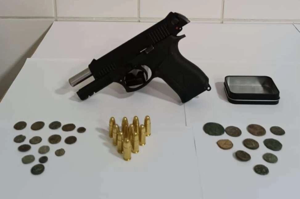 Ekipler, söz konusu evde yaptıkları aramada, tarihi eser niteliğinde olduğu değerlendirilen 23 sikke, bir tabanca ve 10 mermi ele geçirdi.