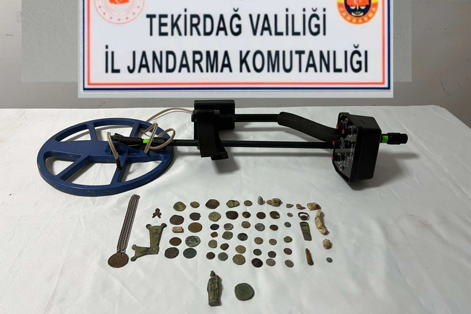 Tekirdağ İl Jandarma Komutanlığınca Malkara ilçesi Sağlamtaş Mahallesi'nde E.B ve H.Ç isimli şahısların evlerinde yapılan arama sonucunda 57 adet farklı şekil ve boyutlarda tarihi eser obje, 1 adet kolye obje, 1 adet define arama dedektörü, 1 adet heykel obje ele geçirildi. Şüpheli şahıslarla ilgili işlem başlatıldı.