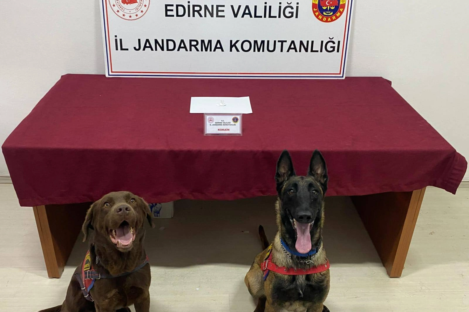 Edirne ili Merkez ilçe sorumluluk bölgesinde, Etik ve Yama isimli uyuşturucu madde tespit köpekleri ile gerçekleştirilen kontrol faaliyetinde, sürücülüğünü S.K. isimli şahsın yaptığı araçta yapılan uygulama neticesinde 0,8 gram kokain maddesi ele geçirilerek el konuldu.