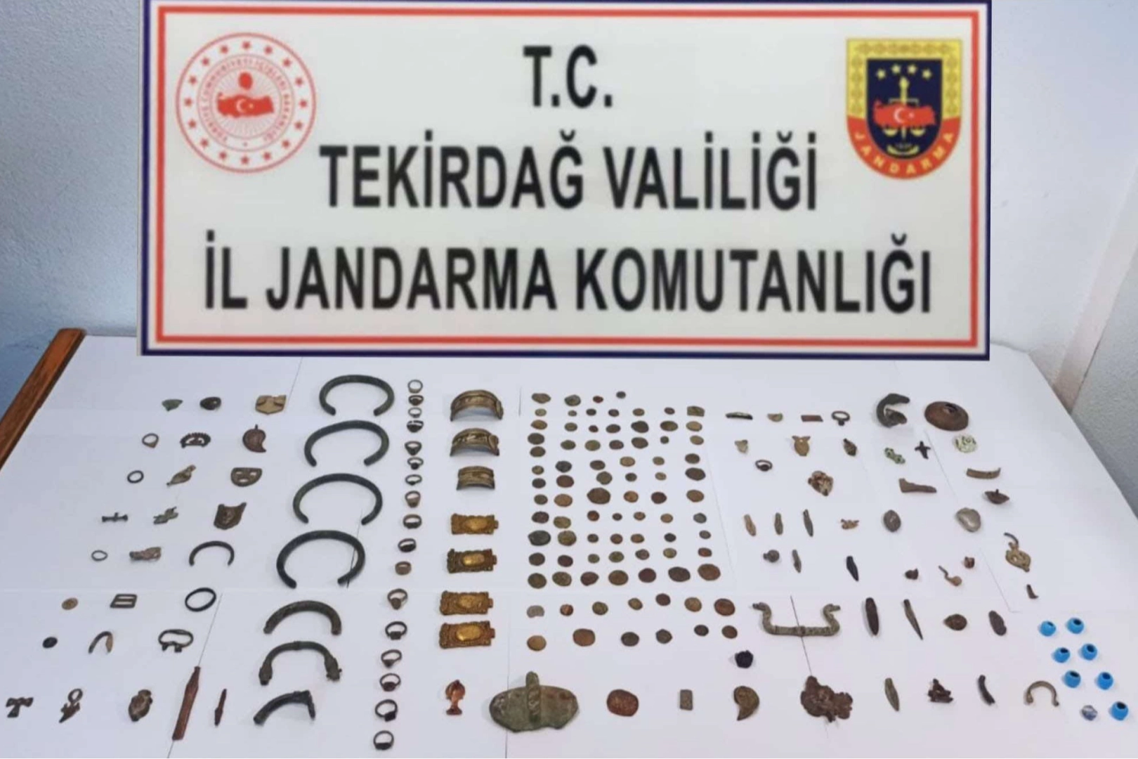 Süleymanpaşa Nusratlı Mahallesinde bir araçta tarihi eser bulunduğu ihbarı jandarma ekiplerini harekete geçirdi. Tekirdağ İl Jandarma Komutanlığı unsurlarınca yapılan aramada araç içerisinde 85 adet sikke ve 112 adet tarihi eser objesi ele geçirildi. Araç içerisinde bulunan M.T., V.T. ve U.B. isimli şüpheli şahısların ifadesi alınmak üzere gözaltına alındı.