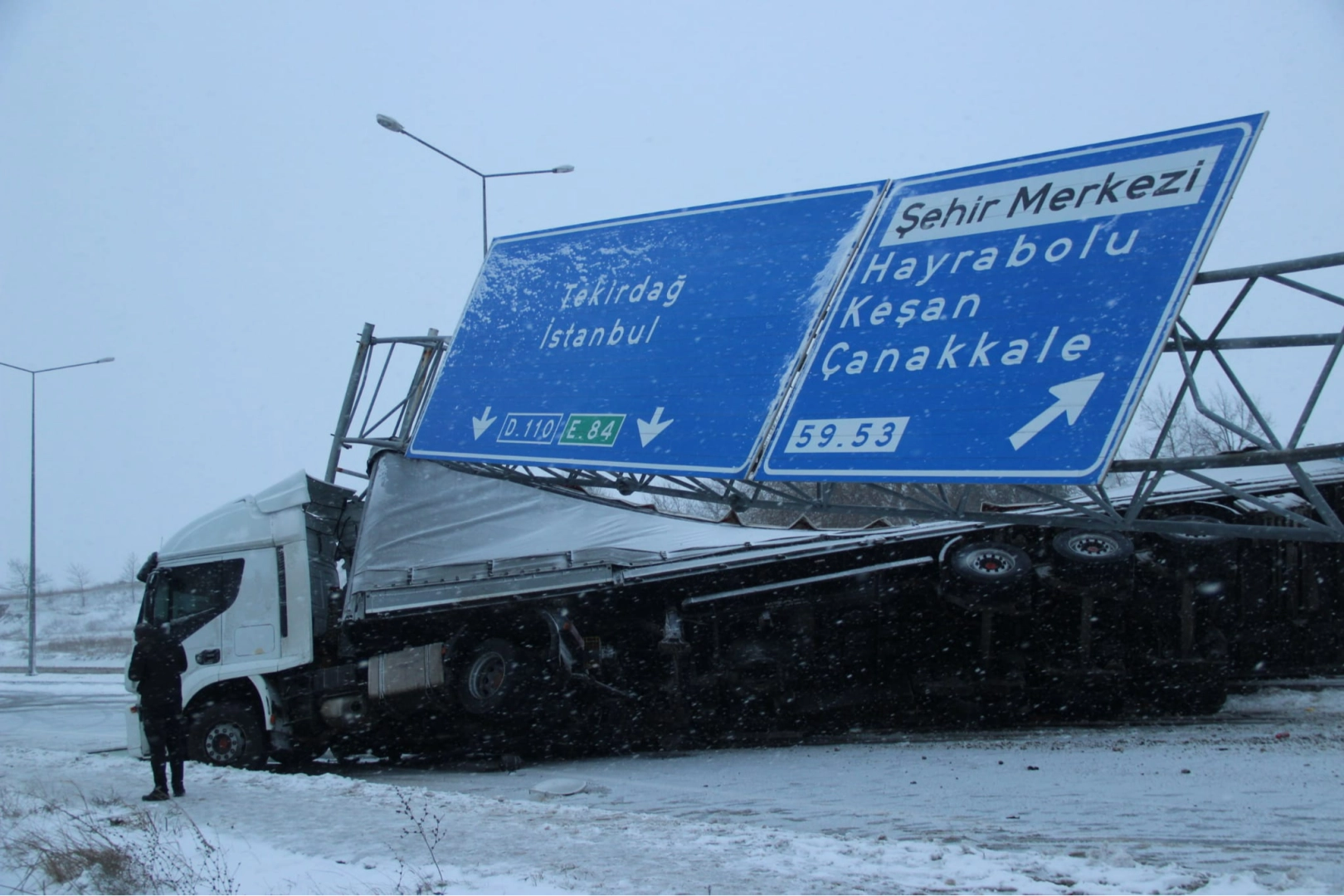 Emre E. yönetimindeki sanayi malzemesi yüklü 59 *** 048 plakalı TIR, yoğun kar yağışı sonucu oluşan buzlanma nedeniyle trafik levhalarına çarparak devrildi. Sürücü kazada yara almadı.