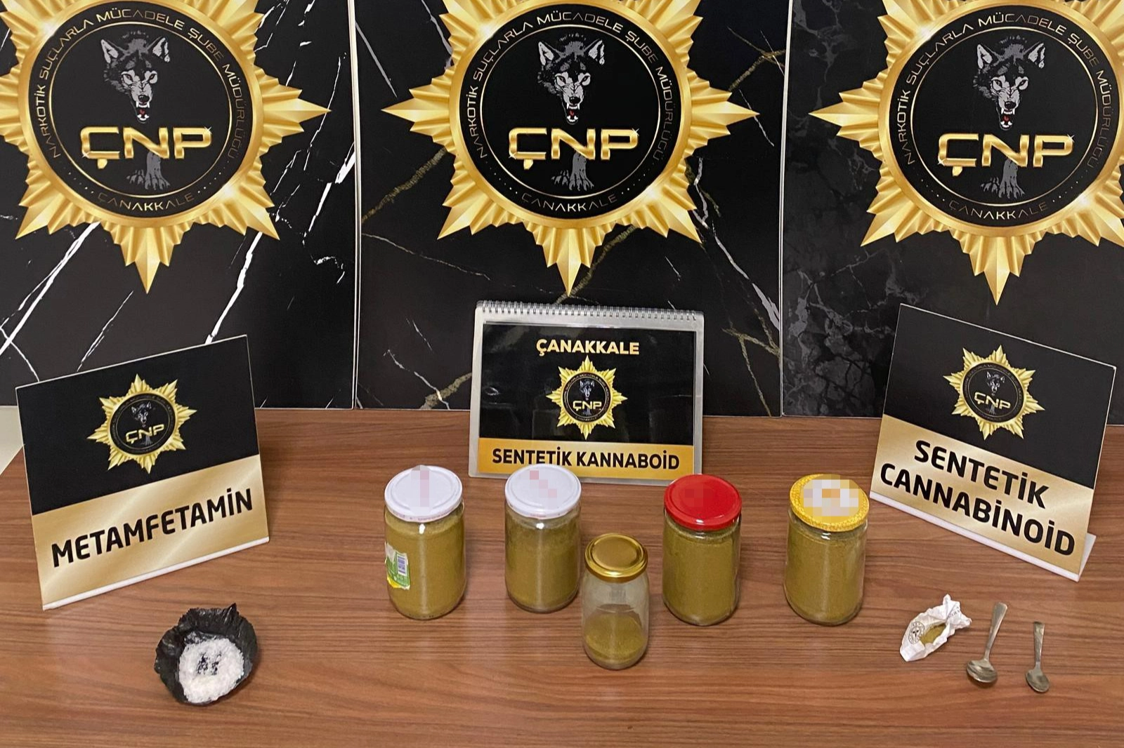 Çanakkale İl Emniyet Müdürlüğü Narkotik Suçlarla Mücadele Şube Müdürlüğü ekiplerince dün ‘Uyuşturucu Madde Satışı yapan ve Kullanan Şahıslara’ karşı mücadeleye yönelik operasyon gerçekleştirildi. İl merkezinde düzenlenen operasyonda Ö.H ve A.Ü. şüpheli şahıslar yakalandı. Şüphelilerin ikametleri ve üzerlerinde yapılan aramalar sonucunda 5 kavanoz içerisinde toplam 2 kilo 31 gram sentetik kannabinoid, 11,49 gram metamfetamin ele geçirildi. Yakalanan şüpheliler hakkında ‘Uyuşturucu Madde Ticareti ve Uyuşturucu Madde Kullanmak’ suçlarından işlem yapıldı. Şüphelilerin işlemleri ardından mahkemeye sevk edildi. Ö.H. çıkarıldığı mahkemece tutuklanırken A.Ü. serbest bırakıldı.
