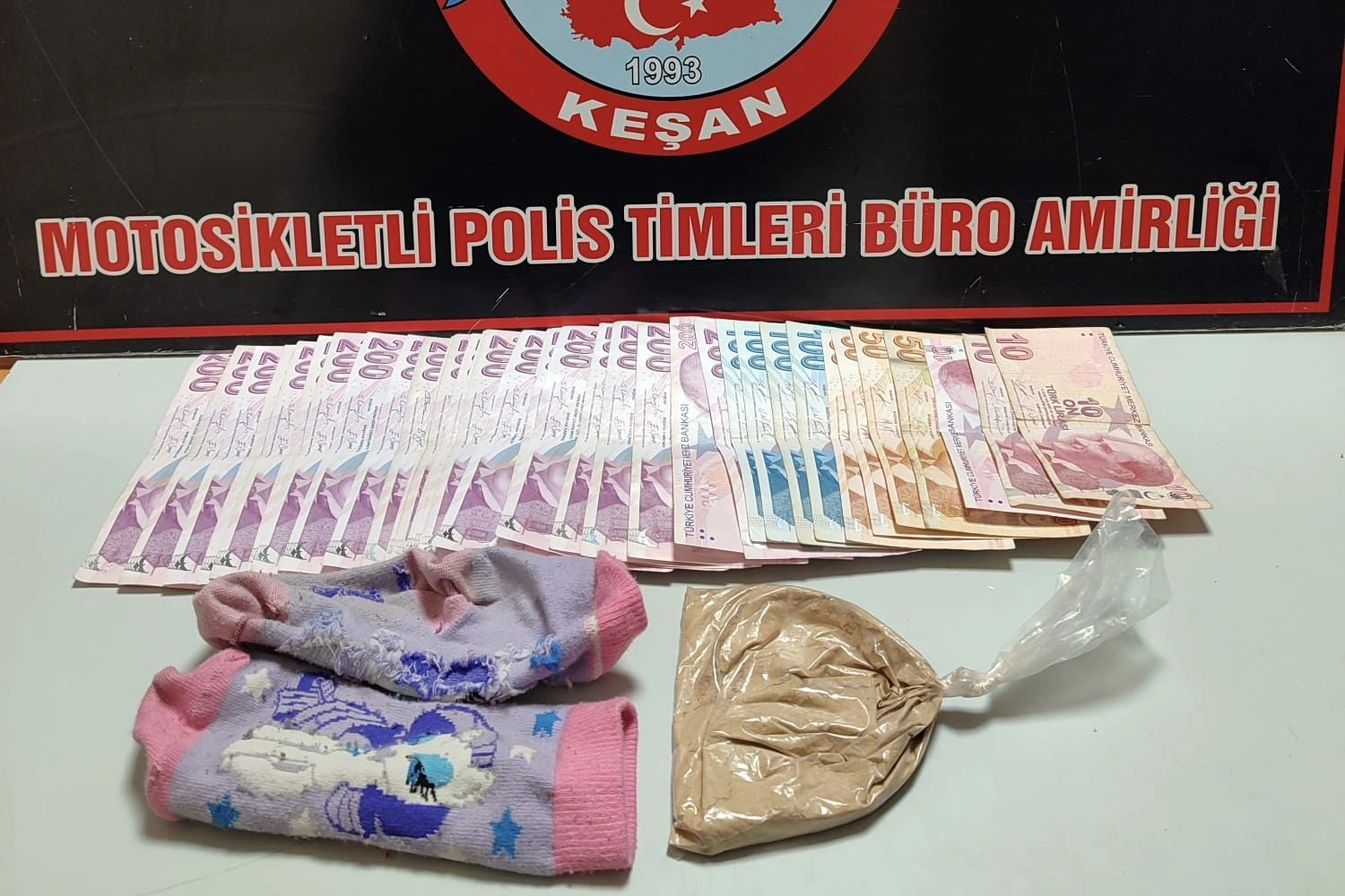 Keşan ilçesinde motosikletli polis timi şüpheli bir aracı takibe aldı. Takip edildiğini anlayan araçtaki şüpheliler camdan dışarıya çocuk çorabı attı. Çorabın içerisinde 50 gram eroin ele geçirildi.