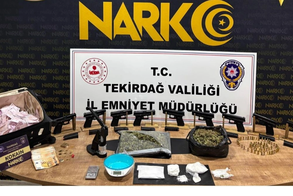 Çorlu Cumhuriyet Başsavcılığı koordinesinde, Tekirdağ İl Emniyet Müdürlüğü Narkotik Suçlarla Mücadele Şube Müdürlüğü ekipleri, Çorlu ilçesinde 3 farklı ikamete eş zamanlı operasyon düzenledi. Operasyonda toplam 873,43 gram esrar, 320 gram kokain, 9 adet ruhsatsız tabanca, 9 adet şarjör, 67 adet tabanca fişeği, 1 adet press makinesi ve 2 adet hassas terazi ele geçirildi. Ayrıca uyuşturucu ve uyarıcı madde ticaretinden elde edildiği değerlendirilen toplam 910 bin TL değerinde para, döviz ve altın da ele geçirildi. Gözaltına alınan 2 şüpheli hakkında 6136 sayılı kanuna muhalefet ile uyuşturucu ve uyarıcı madde ticareti suçlarından adli işlem başlatıldı.