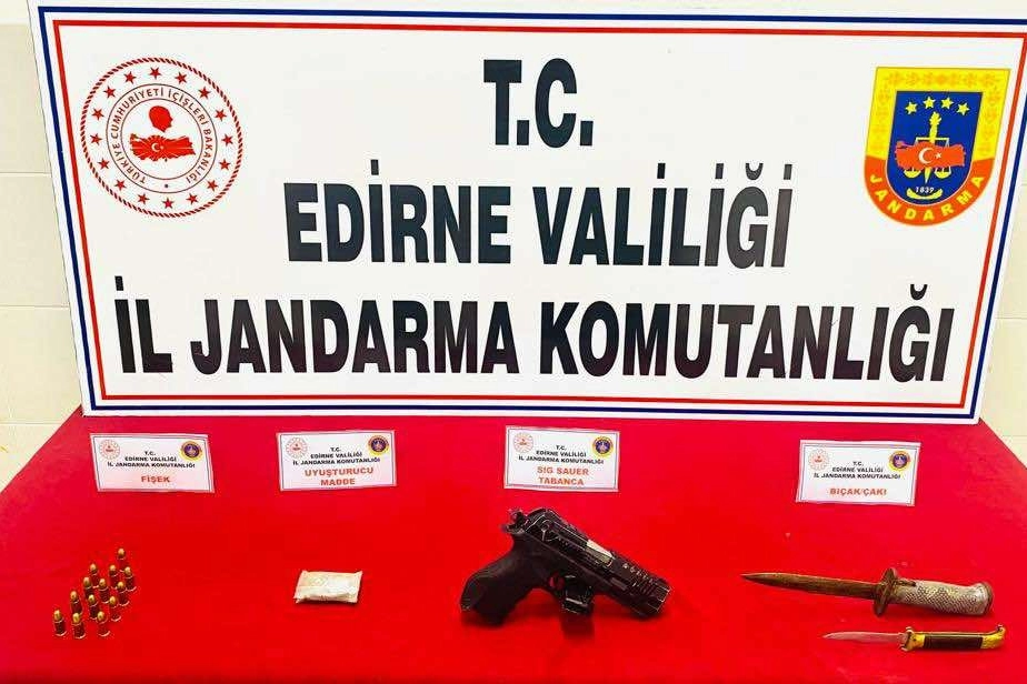 İpsala İlçesine bağlı Sarıcaali köyünde yapılan yol kontrolünde dur ihtiranı uymayarak kaçan ve takip sonucu yakalanan şüpheli B.Y. ve S.Y'nin içinde bulunduğu araçta yapılan aramada, bir adet 9 mm çapında tabanca, 13 adet fişek ve 5 gram uyuşturucu madde ele geçirildi.
