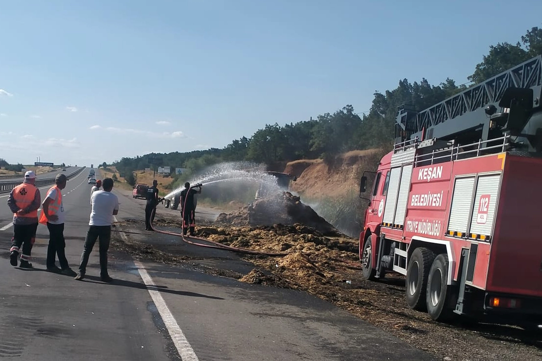 Yangın, akşam saatlerinde Keşan- Gelibolu karayolu üzerindeki İzzetiye Kavşağı yakınlarında meydana geldi. Gelibolu’dan, Keşan yönüne ilerleyen M.F. yönetimindeki 22 LP *** plakalı traktöre bağlı 2 römorkta bulunan saman balyaları, bilinmeyen nedenle tutuşarak, yanmaya başladı. Yoldan geçen sürücülerin uyarısı üzerine durumu fark eden M.F., traktörü römorklardan ayırarak, durumu itfaiyeye bildirdi. Olay yerine giden itfaiye ekipleri yangına müdahale ederek söndürdü. Yangın sonucu saman balyaları ve römorklar kullanılamaz hale geldi. Jandarmanın olayla ilgili incelemesi sürüyor