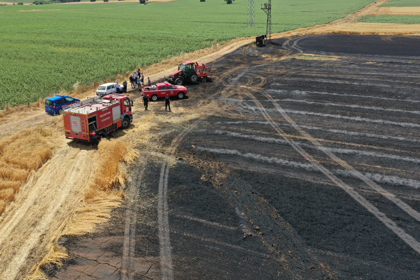 İtfaiye ekiplerinin müdahalesinin ardından söndürülen yangında 20 dönüm buğday ekili alan zarar gördü.