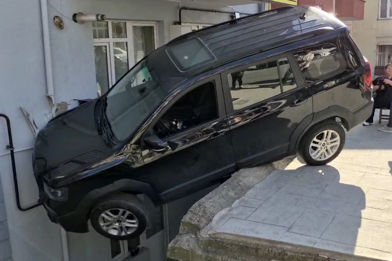 Kaza nedeniyle araç, kot farkı bulunan evin balkonunda asılı kaldı.