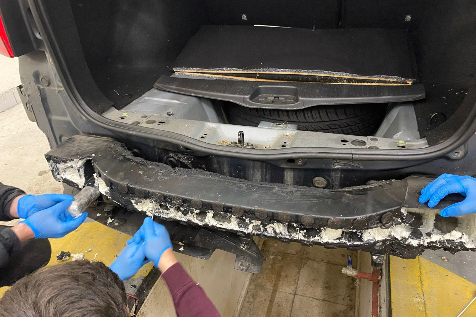 Öte yandan şüpheli yoğunluk tespit edilen minibüsün zeminine yerleştirilen ve suntayla kapatılan bölmede metal plakalar bulundu. Plakaların altındaki lastik kauçuk maddelerin içerisinde vakumlu poşetlerde 45 kilo 823 gram kokain ele geçirildi.