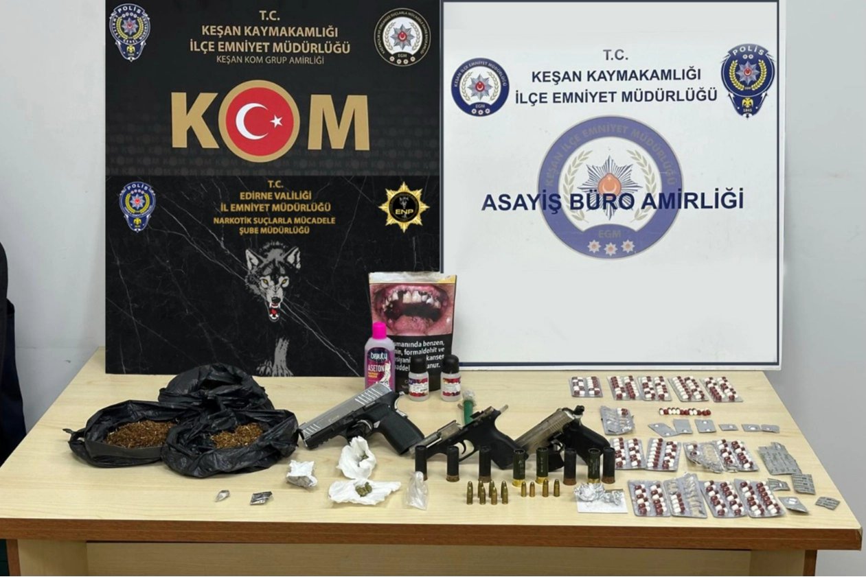 İl Emniyet Müdürlüğü ile Keşan İlçe Emniyet Müdürlüğü Kaçakçılık ve Organize Suçlarla Mücadele, Narkotik Suçlarla Mücadele ve İstihbarat Şube Müdürlüğü ekipleri tarafından uyuşturucu operasyonu düzenlendi. Ekipler, 20 adrese eş zamanlı baskın yaptı. Yapılan aramalarda 7 ruhsatsız tabanca, 3 ruhsatsız av tüfeği, 155 av tüfeği fişeği, 63 mermi, 1 kama, 262 gram bonzai, 196 sentetik uyuşturucu hap, 11,68 gram metamfetamin, 5,65 gram esrar ve 1 uyuşturucu hap ele geçirildi. Operasyonda 20 kişi gözaltına alındı.