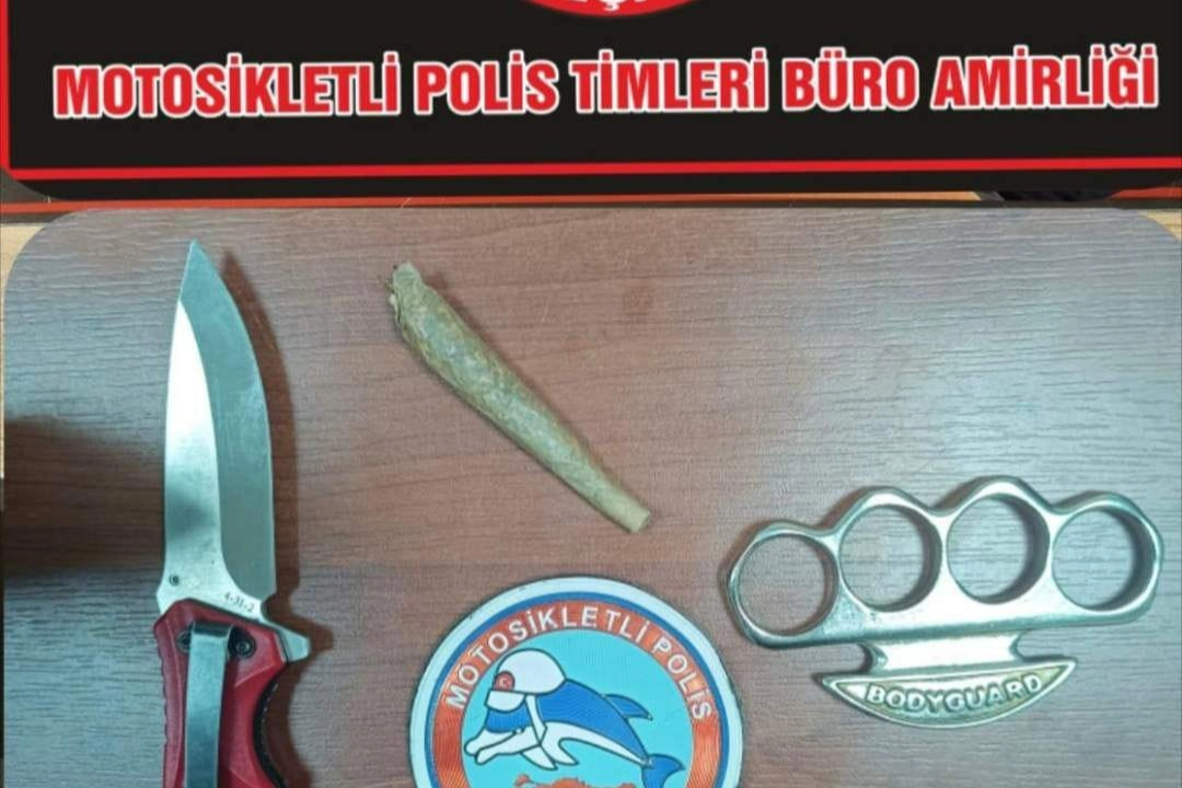 Alınan bilgiye göre; Yukarı Zaferiye Mahallesi Hastane Caddesi'nde plakasız motosikleti durduran Keşan İlçe Emniyet Müdürlüğü ekipleri, ehliyetsiz olduğu tespit edilen motosiklet sürücüsü M.A.'nin üst aramasında, muşta ele geçirdi. Motosiklette yolcu olarak bulunan E.C.K.'nın üst aramasında da uyuşturucu ile bıçak ele geçiren polis, motosiklet sürücüsü M.A.'ya ilgili maddelerden toplamda 27 bin 72 TL idari para cezası kesti. Motosiklet yediemin otoparkına çekildi.