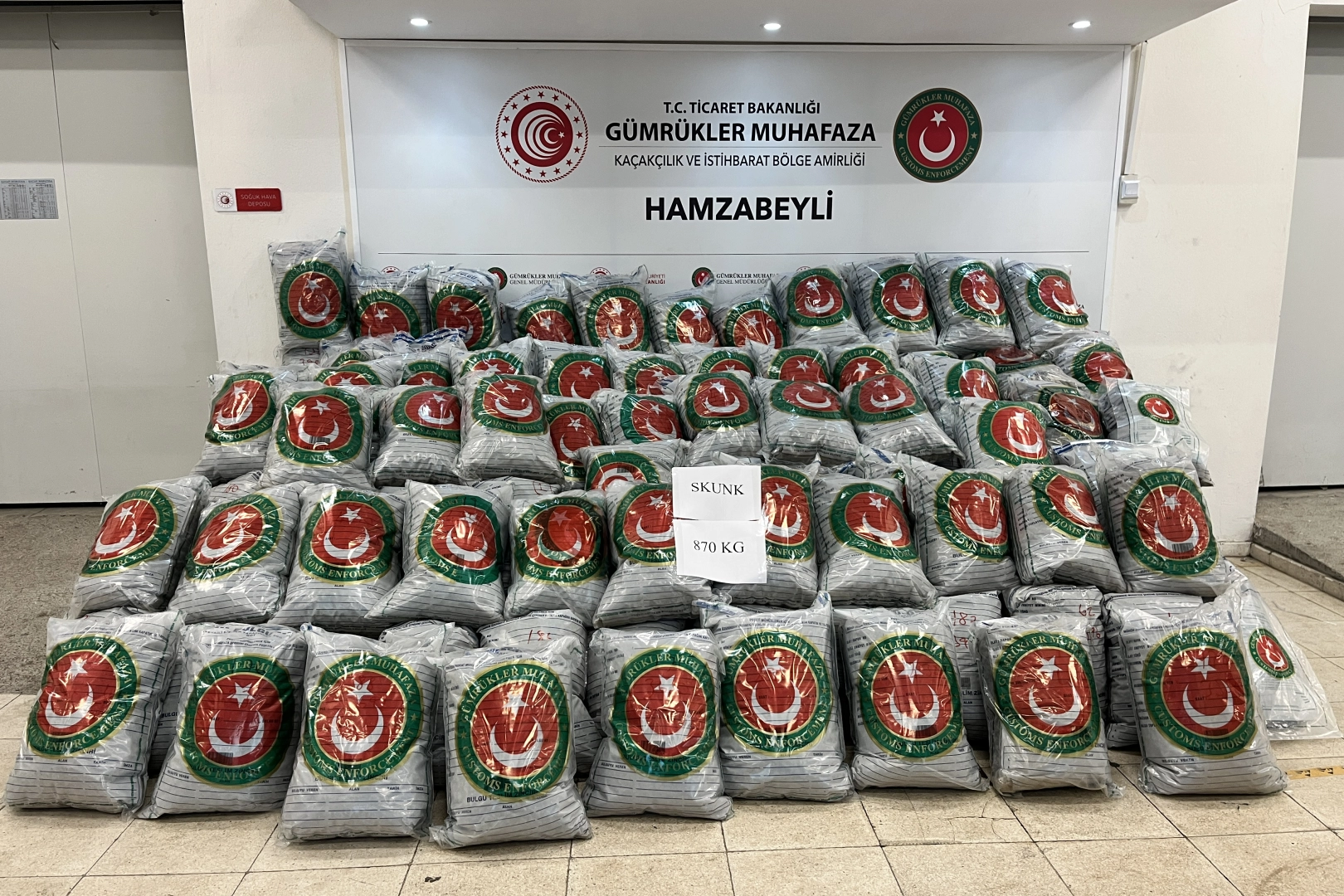 Tırda yoğunluk tespit edilmesi nedeniyle narkotik dedektör köpek yardımıyla yapılan aramada, yükün içine gizlenmiş 870 kilogram skunk ele geçirildi.