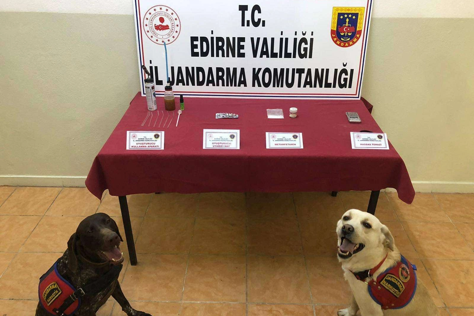 Edirne’nin Havsa ilçesinde uyuşturucu madde arama köpek unsuruyla gerçekleştirilen uygulamada bir araç içerisinde yapılan aramada, 61,3 gram metamfetamin, 9 adet uyuşturucu kullanma aparatı, 4 adet uyuşturucu hap, 2 adet pürmüz ele geçirilerek el konuldu.