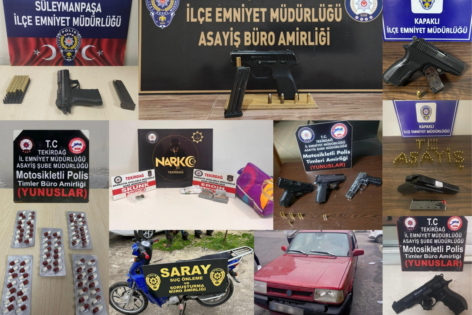 Tekirdağ İl Emniyet Müdürlüğü tarafından suç işlenmesinin önlenmesine yönelik yapılan çalışmalar ve uygulamalar kapsamında, 2 haftalık çalışmalarda, 36 bin 944 şahsın sorgulaması yapıldı. Hırsızlık, dolandırıcılık, kasten öldürme, uyuşturucu madde ticareti, silahlı tehdit suçları başta olmak üzere çeşitli suçlardan aranması olan 110 şahıs yakalanırken bu şahıslardan 52 şahıs tutuklanarak cezaevine teslim edildi. Uygulama ve aramalarda, 27 adet ruhsatsız silah, 3 çalıntı otomobil, 2 çalıntı motosiklet ele geçirildi. Uyuşturucu ile mücadelede yapılan çalışmalarda ise 650 gram eroin, 2 bin 966 adet extacy hap, 56 gram metamfetamin, 98 gram skunk, 107 gram bonzai uyuşturucu maddesi ele geçirildi. Olaylarda 63 şüpheli şahsa işlem yapıldı. Kaçakçılıkla mücadele ise 6 bin 380 paket gümrük kaçağı sigara, 1600 adet dolu makaron, 1 adet sigara sarma makinası, 34 kilogram tütün, 163 şişe gümrük kaçağı içki, 18 litre el yapımı içki, 8 tarihi obje ele geçirildi. Olaylarda 9 şüpheli hakkında gerekli işlemler yapıldı. Toplamda 236 şüpheli yakalanırken bu şüphelilerden 67’si şüpheli tutuklandı.