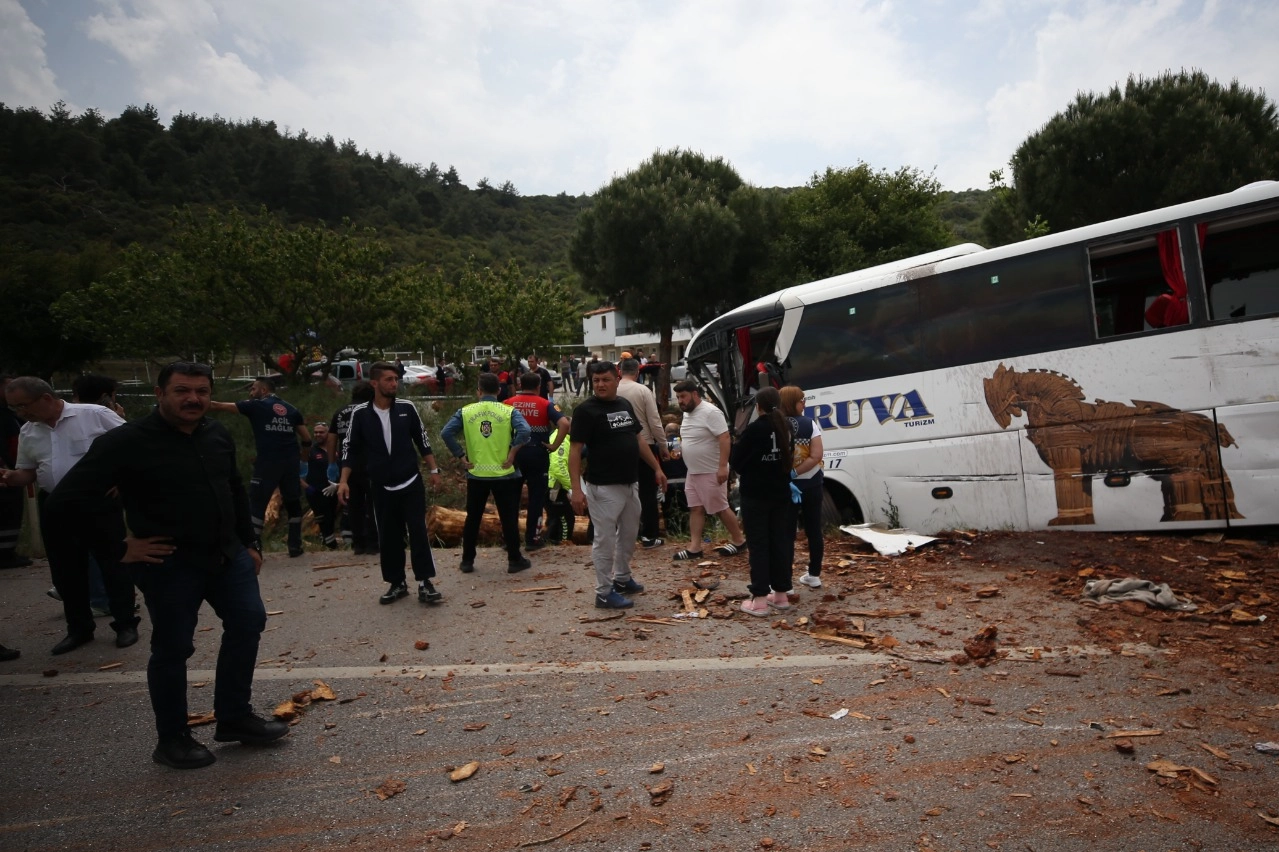 Çanakkale-Ezine kara yolunda Çanakkale Truva Turizm'e ait 17 A** 624 plakalı yolcu otobüsü, 33 A** 274 plakalı odun yüklü kamyon ve otomobil çarpıştı.