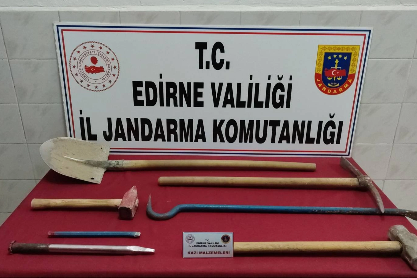 Edirne’nin Enez ilçesinde gerçekleştirilen operasyon sonucunda, 2 şahıs tarihi eser aramak amacıyla kaçak kazı yaparken bir adet kürek, bir adet kazma, bir adet balyoz, bir adet manivela, 2 adet murç ve bir adet çekiç ile birlikte suçüstü yakalandı.
