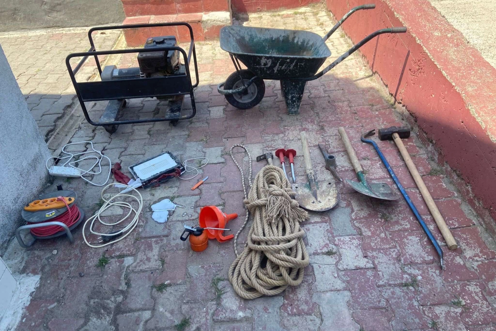 Kazı yapılan alandaki aramada, jeneratör, hilti matkap, 150 metre elektrik kablosu ile kepçe ele geçirildi.