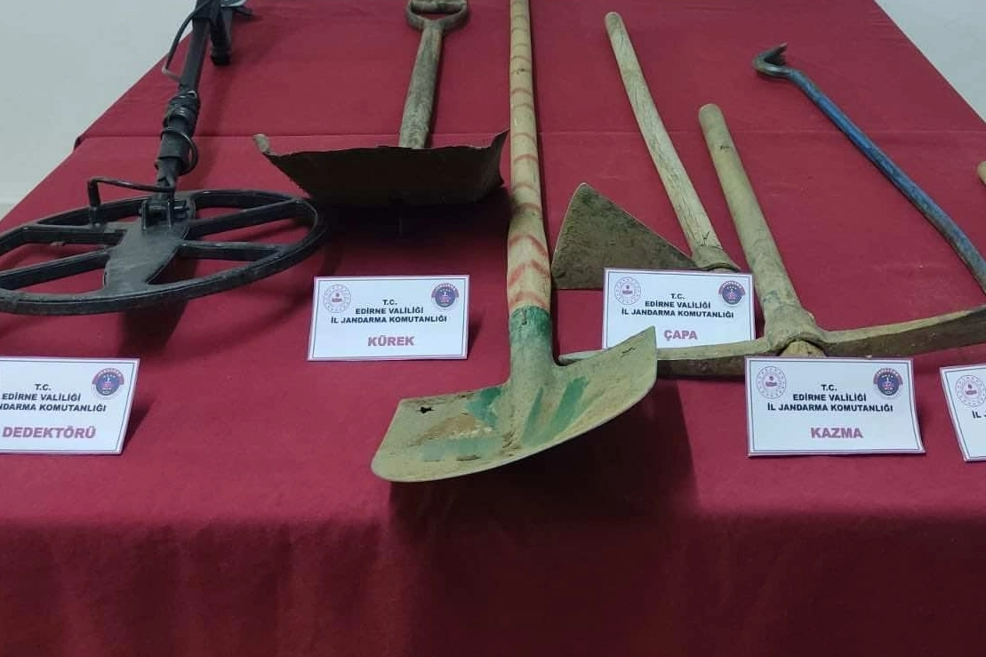 Aramada, 2 dedektör, 2 ruhsatsız tabanca ve kazı malzemeleri ele geçirildi.