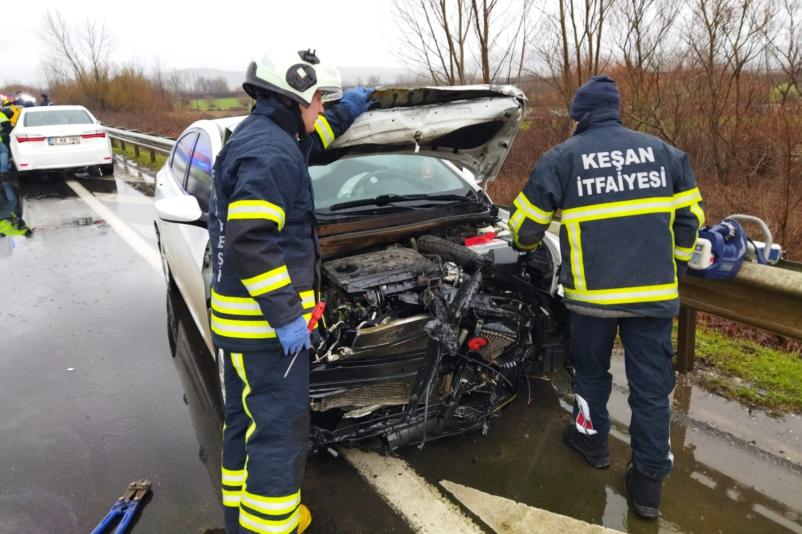 Alınan bilgiye göre, Çanakkale'nin Gelibolu ilçesi istikametinden Keşan istikametine giden C.M.G. yönetimindeki 34 ** 5575 plakalı Hyundai marka otomobil, Mahmutköy Kavşağı yakınlarında, kayganlaşan yolda kontrolden çıkarak bariyerlere çarptı. Kazada, sürücü C.M.G. ile otomobilde yolcu olarak bulunan A.K.G, R.G. ve P.G. yaralandı. İhbar üzerine kaza yerine jandarma, polis ve sağlık ekipleri sevk edildi. Jandarma ve polis ekipleri yolda güvenlik önlemi alırken, yaralılar, ambulanslar ile kaldırıldıkları Keşan Devlet Hastanesi’nde tedavi altına alındı.