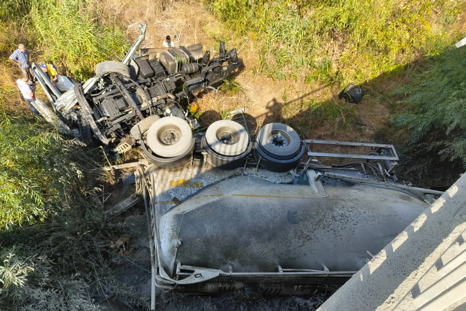Şafak Özkan idaresindeki 39 *** 066 plaka tır, Ürünlü köyü yakınlarında köprüden dereye devrildi.