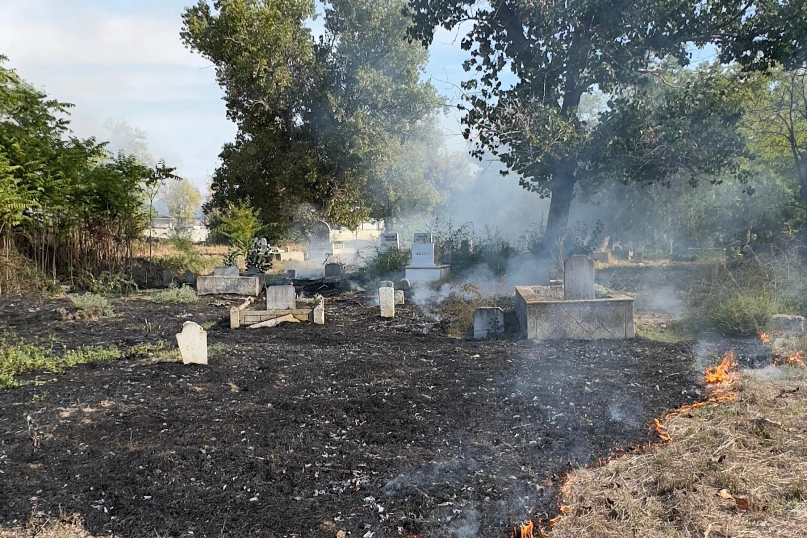Ekiplerin müdahalesi ile söndürülen yangında bazı ağaçlar ve mezar taşları zarar gördü.
