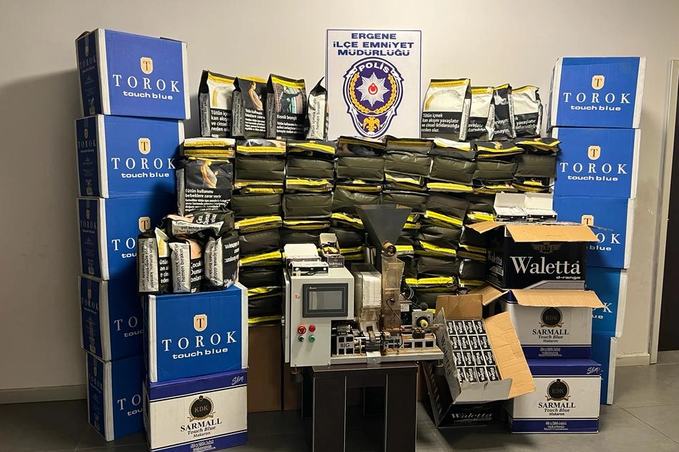 Aramada 159 bin makaron, 101 kilogram tütün ve sigara dolum makinesi ele geçirildi.