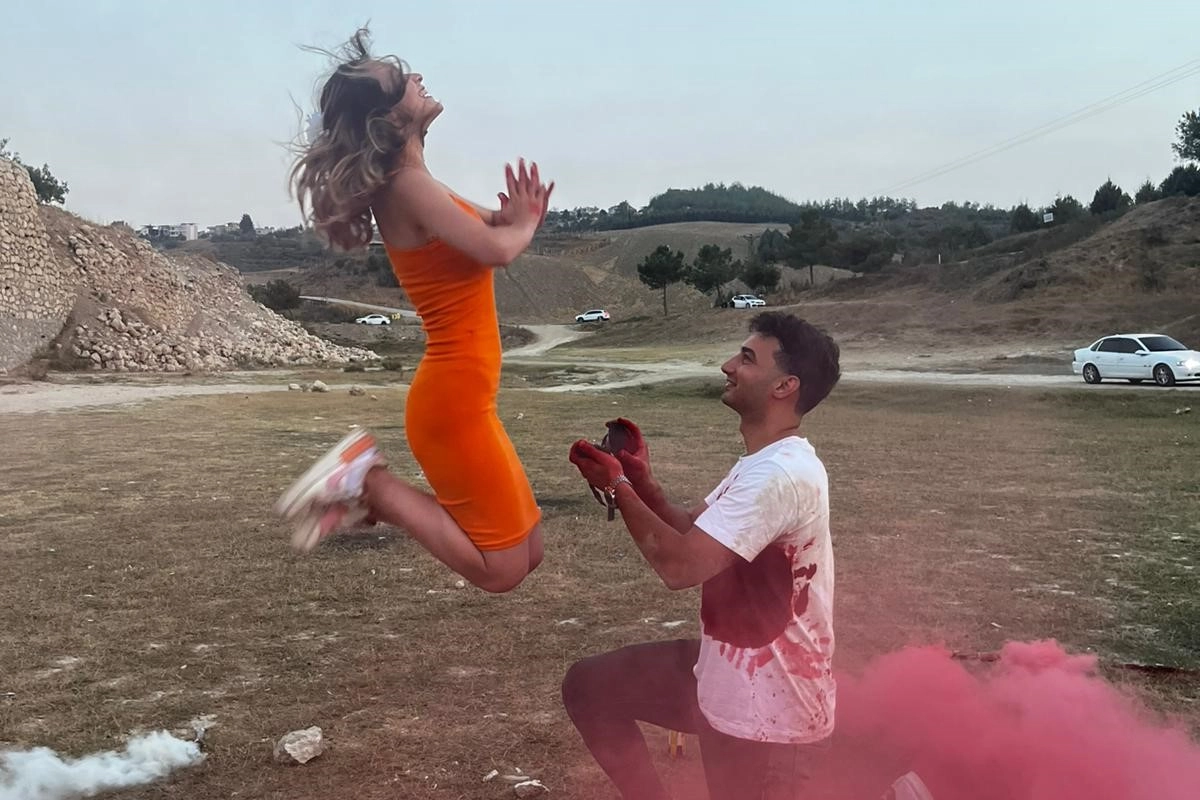 29 yaşındaki Şakir Karakaya, 26 yaşındaki sevgilisi Nazlı Gümüş'e evlilik teklifi etmek için iş arkadaşlarıyla birlikte merkez Çukurova ilçesinde bir mesire alanında organizasyon düzenledi. Çift, iş arkadaşlarıyla birlikte mesire alanına gittikleri sırada Şakir Karakaya'nın yanına motosikletli bir şahıs yanaştı ve ikili arasında arbede yaşandı. Bu sırada otomobilin arkasına geçen ikiliden Şakir Karakaya, silahla vurulmuş gibi yapıp üzerini gıda boyası döktü. Sürpriz gereği yere yığılan Karakaya'nın yardımına, kız arkadaşı Nazlı Gümüş koştu. Panik halindeki Gümüş'e, Karakaya cebinden çıkardığı yüzük ile evlilik teklifi etti. Hayrete düşen Gümüş ise teklifi kabul etti. Çevredekiler polis çağırdı Ancak bu sırada patlayan torpili çevredeki vatandaşlar silah sanarak durumu polis ekiplerine bildirdi. Bölgeye gelen ekipler çifti ve arkadaşlarını karakola götürdü. Karakolda ifadeleri alınan çift, daha sonra serbest bırakıldı. "İfade verip çıktık" Gazetecilere konuşan Şakir Karakaya, sevgilisinin yıllardır adrenalin dolu bir evlilik teklifi istediğini anlatarak, "Nazlı benim 14 yıllık sevgilim, çocukluk aşkım. Çocukluktan beri romantik bir evlilik teklifi istemedi. Adrenalin olsun, korku olsun istedi. Ben de böyle bir plan düşündüm. Çok güzel oldu, teklife evet aldık. Arkadaşlarımla beraber kavga ediyormuşum, vuruluyormuşum gibi gösterip kendimi yere attım. Silah sesi gibi gelmesini istedik, torpil kullandık. Arabanın arkasında yapıp yere yattık. Kan içinde gıda boyası kullandık. Çevredeki insanlar gerçek sandı. O kadar iyi oynadık ki herhalde gerçek sanıp şikayet ettiler. Polisler de gelip şikayet üzerine bizi karakola götürdüklerini söylediler. İfade verip çıktık" diye konuştu. "İyi ki evet" Nazlı Gümüş ise evlilik teklifinin hayallerindeki gibi olduğunu belirterek, "Yaşadığımız kötü bir durumdu ama hep hayalim olan bir evlilik teklifi aldım. Çok mutluyum. İyi ki evet" dedi.