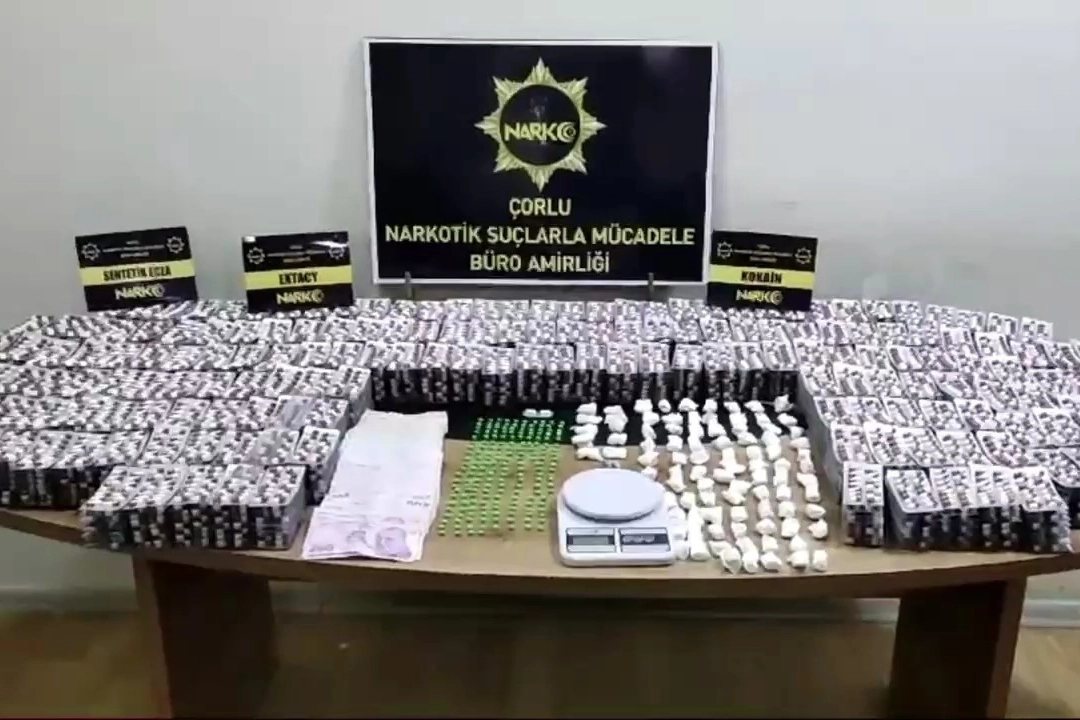 Tekirdağ İl Emniyet Müdürlüğü Narkotik Suçlarla Mücadele Şube Müdürlüğü ekiplerince Çorlu ilçesi Hıdırağa Mahallesi'nde bir adrese operasyon düzenlendi. Operasyonda ikamet ve eklentilerinde yapılan aramada 20 bin 720 adet sentetik ecza hap, 187 adet ectazy hap, 93 fişek 165.5 gram kokain maddesi, 1 adet hassas terazi, uyuşturucu ve uyarıcı madde ticaretinden elde edildiği değerlendirilen 20 bin 875 TL para ele geçirildi. Ayrıca ikametin bahçesinde 2 adet şase numarası silinmiş, 1 adet çalıntı kaydı olan motosiklet tespit edilerek el konulurken, 2 kişi gözaltına alındı.