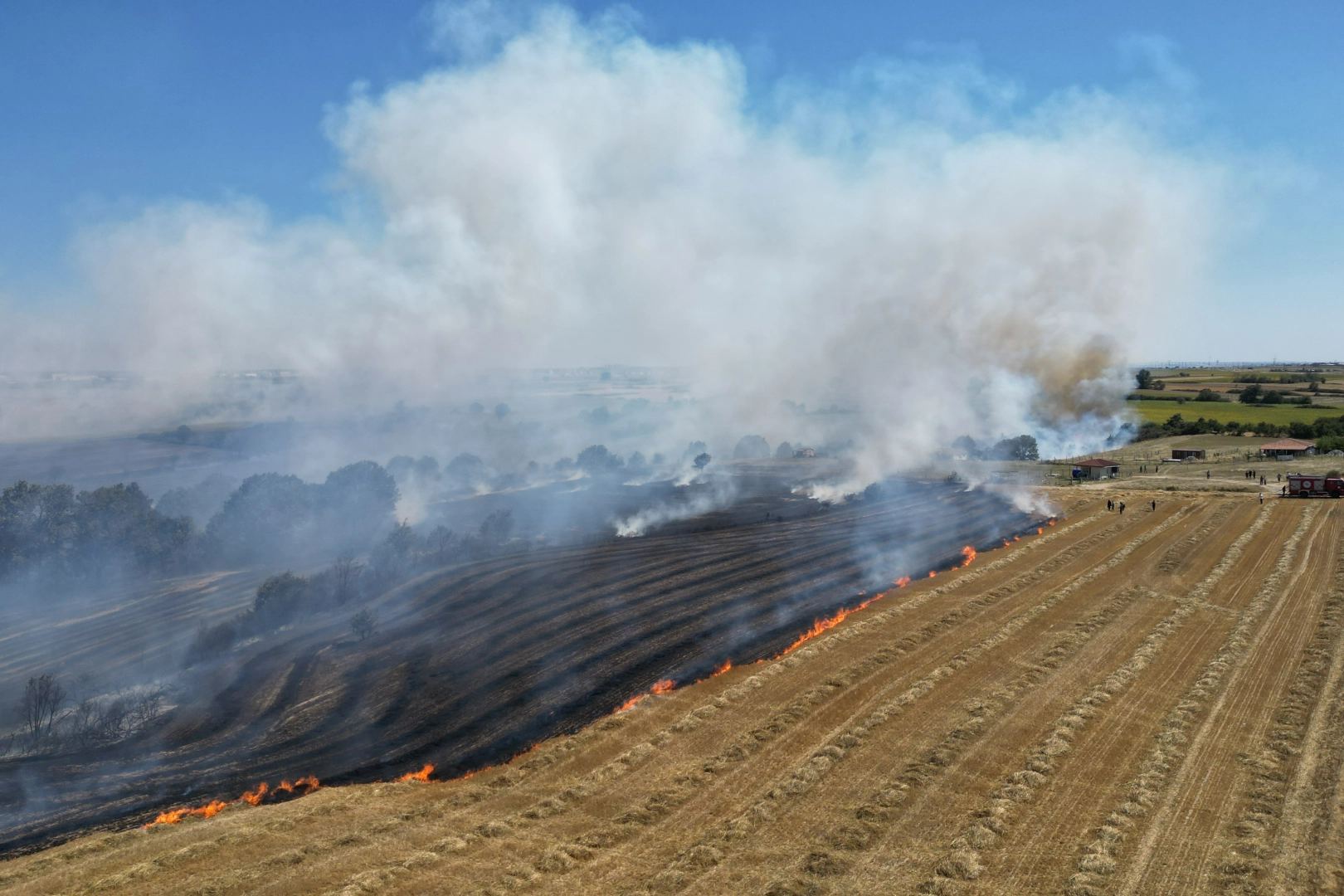 Büyükyoncalı Mahallesi'nin Bozoba mevkisindeki biçilmiş buğday tarlasında henüz belirlenemeyen nedenle yangın çıktı.