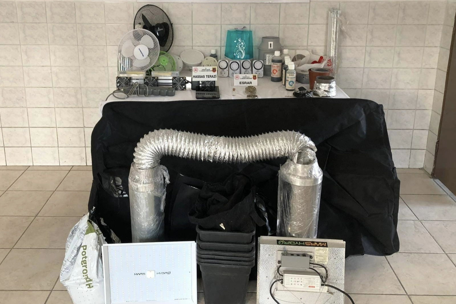 Aramada, iki iklimlendirme çadırı, üç vantilatör, termometre, fanlar, bitki besleyici sıvı, aydınlatma sistemi, hassas terazi ile bir miktar esrar ve kenevir tohumu ele geçirildi.