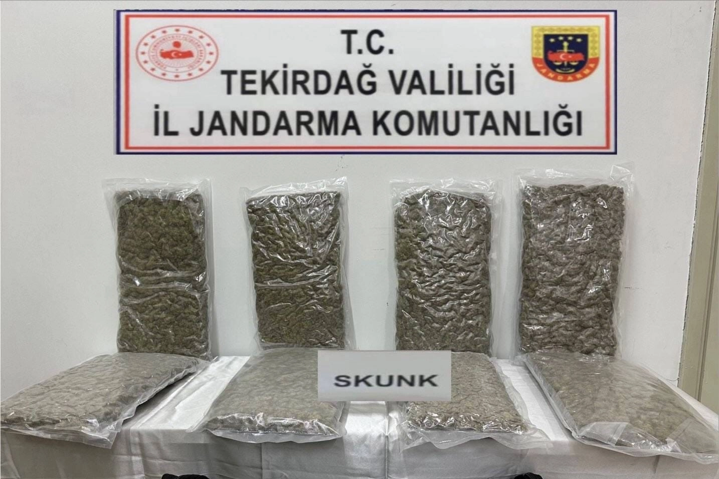 Tekirdağ İl Jandarma Komutanlığı ekipleri, 24 Haziran 2025 günü Ergene ilçesindeki Avrupa Otoyolu Çorlu Gişeleri'nde H.Ç. isimli şahsın kullandığı aracı durdurdu. Narkotik köpeği eşliğinde yapılan aramada aracın gizli bölmelerine yerleştirilmiş halde 12 kilogram skunk olduğu değerlendirilen uyuşturucu madde bulundu. Gözaltına alınan H.Ç., "Uyuşturucu veya uyarıcı madde imal ve ticareti yapmak" suçundan tutuklandı.