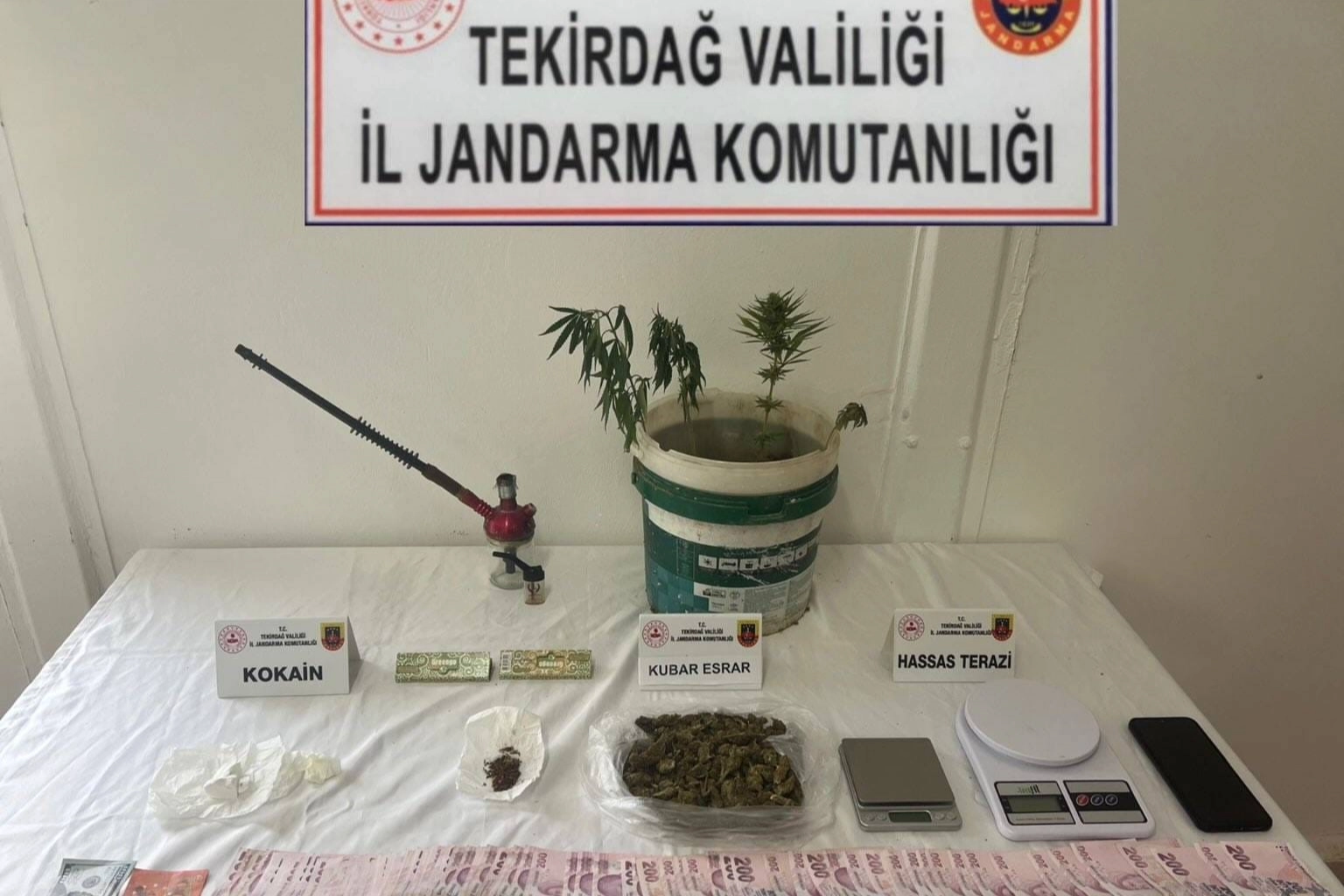 Tekirdağ İl Jandarma Komutanlığı ekipleri tarafından Şarköy Camikebir Mahallesi'nde gerçekleştirilen operasyonda, Ş.D. isimli şahsın evinde yapılan aramada çeşitli miktarlarda uyuşturucu madde ve malzemeler ele geçirildi. Gerçekleştirilen aramada, 102 gram esrar, 19 gram kokain, 4 kök kenevir, 2 adet hassas terazi ve uyuşturucu satışından elde edilen 20 bin 975 TL, 100 dolar ve 10 Euro ele geçirildi. Şüpheli şahıs gözaltına alınarak hakkında adli işlem başlatıldı.