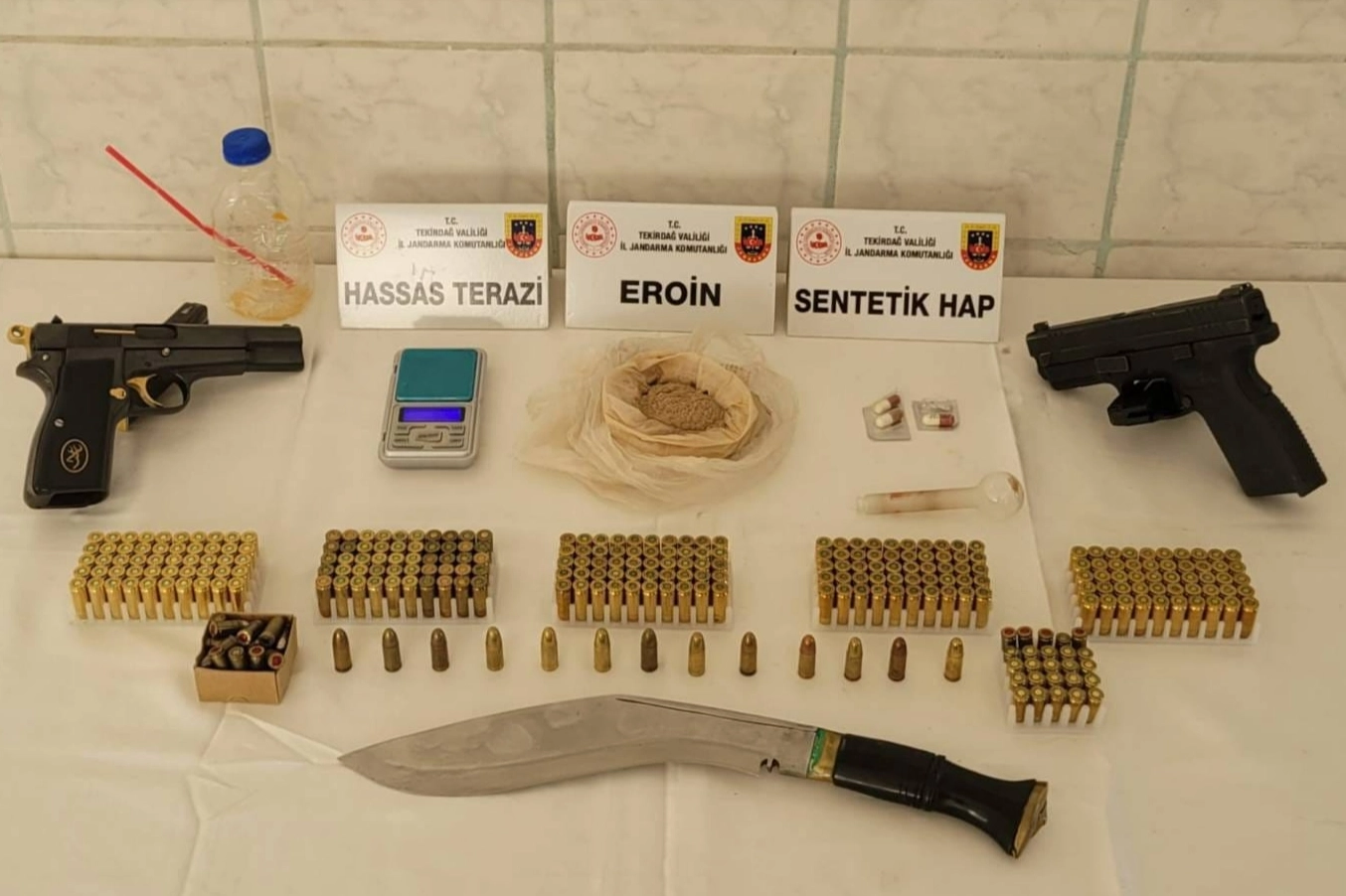 Şüphelilerin üst araması ve adreslerindeki aramalarda, 105 gram eroin, 75 gram sentetik uyuşturucu, 10 sentetik ecza hap, 2 ruhsatsız tabanca, 319 tabanca fişeği ve pala ele geçirildi.