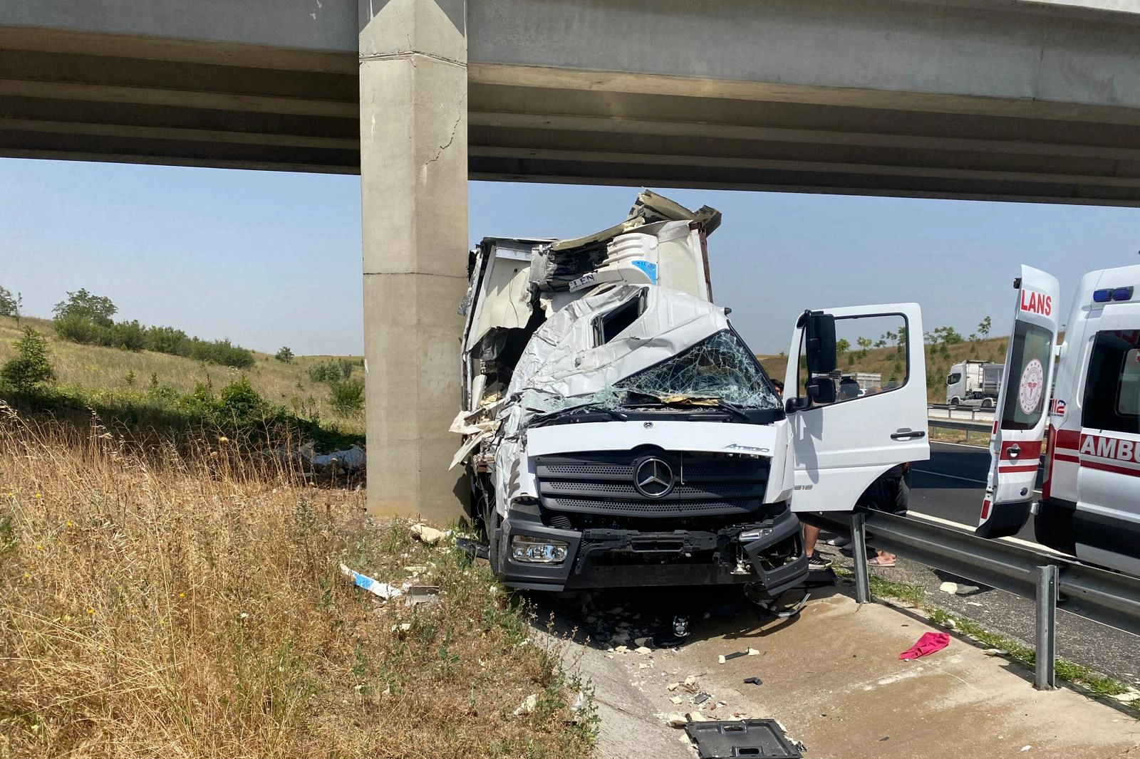Yiğit A. idaresindeki 34 *** 678 plakalı kamyon, Büyükkarıştıran beldesi yakınlarında üst geçidin ayağına çarptı.