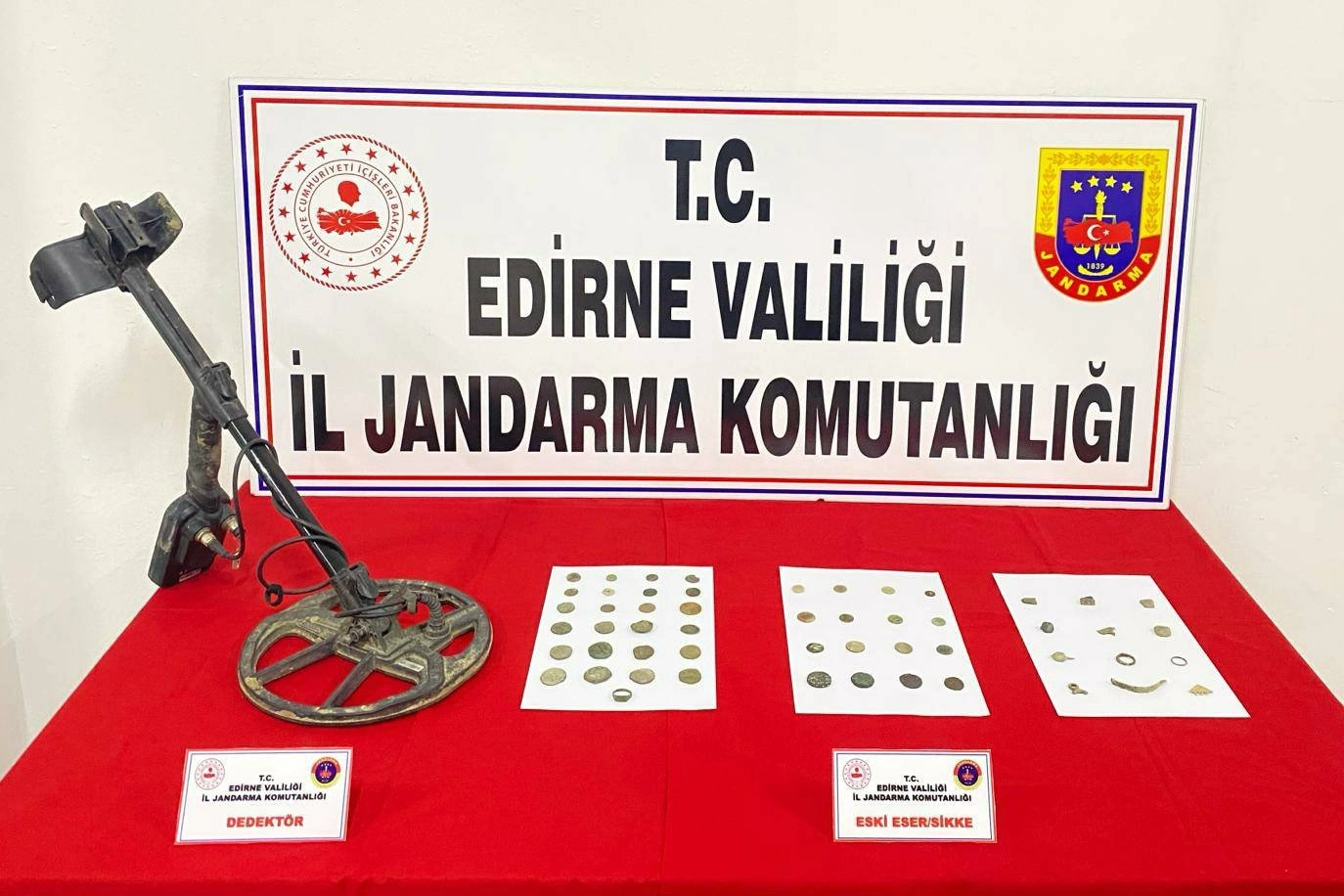 Uzunköprü ilçesinde gerçekleştirilen operasyonda, G.Ç. ve S.G. isimli şahısların evlerinde yapılan aramada Roma ve Bizans dönemlerine ait bir yüzük, 42 sikke, 14 metal obje ve bir dedektör ele geçirildi.