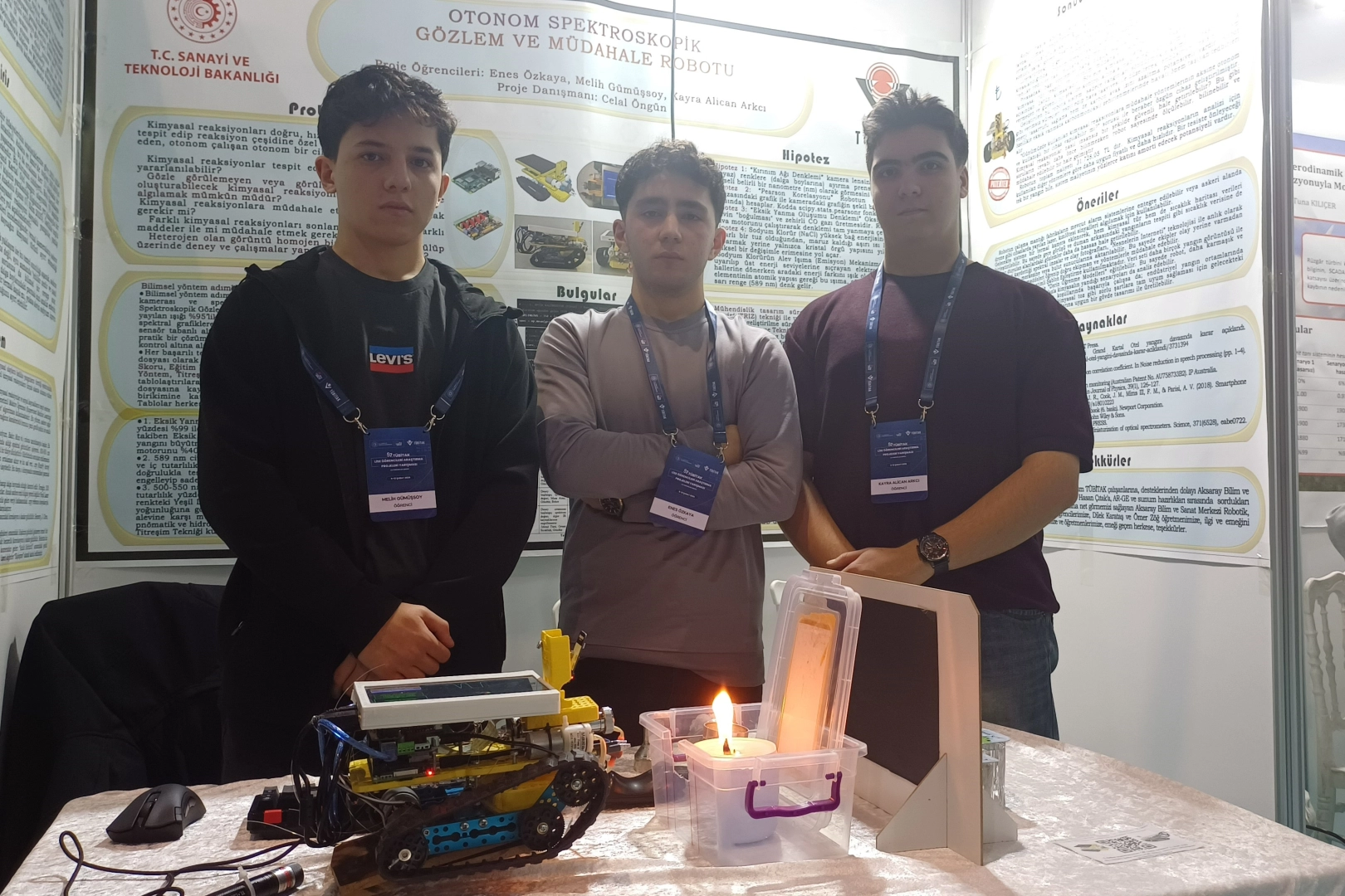 Kayseri'de düzenlenen 57. TÜBİTAK Lise Öğrencileri Araştırma Projeleri Yarışması'na Aksaray Bilim ve Sanat Merkezi'nden katılan öğrencilerin yapmış oldukları Otonom Spektroskopik Gözlem ve Müdahale Robotu, yangınların spektral boylarını tespit ederek her yangın türüne göre farklı bir söndürme tekniğinin devreye girmesini sağlıyor. Robot, eksik yanma, bakır, sodyum gibi farklı ateş türlerini lazer ve kızıl ötesi ile tespit ederek ateşin türüne göre söndürme müdahalesi uygulanmasını sağlıyor. Proje ortaklarından lise 2. sınıf öğrencisi Melih Gümüşsoy, can ve mal kaybını en aza indirmek için doğru söndürme teknikleriyle yangına müdahale etmek istediklerini söyleyerek, "Projenin ana amacı, yangınları spektral parmak izlerine göre analiz yapmak, tespit ve müdahale etmek. Yakın zamanda yaşanan Bolu Kartalkaya Kayak Merkezi'ndeki gibi yangınların büyümesinin sebebi yangının türü. Bu tür yangınlara çözümler üretmek istiyoruz" dedi. Proje ortaklarından lise 1. sınıf öğrencisi Enes Özkaya ise robotun normal bir kameradan farklı olarak bin 920 dalga boyunda kanallara ayırdığını söyleyerek, "Burada yapmış olduğumuz robot tehlikeli kimyasal reaksiyonların ayrışmasında büyük bir kolaylık sağlıyor. Normal bir kameradan farklı olarak 3 değil, bin 920 farklı dalga boyunda kanallara ayırarak inceliyor ve bu incelemeler sonucu spektral analiz grafikleri her bir nanometre 0.26 piksele tekabül edecek şekilde grafikler oluşturuyor. Hafızasında referans grafikler Pearson korelasyonunu kullanarak tehlike anında kaydetmiş olduğu grafiklerle karşılatıyor. Eşik değerini geçtiği zaman yangınları sınıflandırıp gerekli müdahaleleri yapmamızı sağlıyor" ifadelerini kullandı. Lise 2. sınıf öğrencisi Kayra Alican Arkcı da "TÜBİTAK için hazırlığımız bu proje yangınların spektral boylarını tespit ederek her reaksiyona özel bir müdahale imkânı sunuyor. Yaptığımız farklı deneyler sonucunda farklı müdahaleler uygulamaktadır. Sodyum alevi deneyinde robot sadece hava motoru ile müdahalede bulunmaktadır. Çünkü su, sodyum ile tepkimeye girerek bir patlama oluşturma riski var. Eksik yanma deneyinde robot yüzde 40 güçte hava motorunu çalıştırıyor ve oksijen takviyesi yapıyor. Bu sayede zehirli bir gaz olan karbanmonoksit salınımını engellemiş oluyor" dedi.