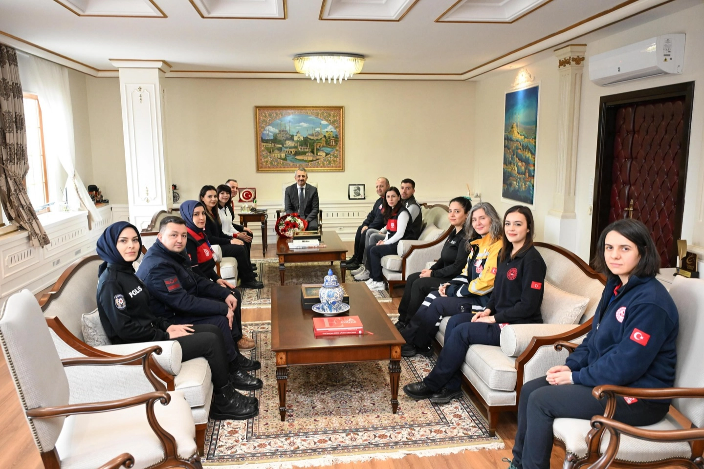 112 Günü kapsamında 112 Acil Çağrı Merkezi Müdürü İsmail Öztuna ve birim temsilcilerinden oluşan heyet, Edirne Valisi Yunus Sezer’i makamında ziyaret etti.