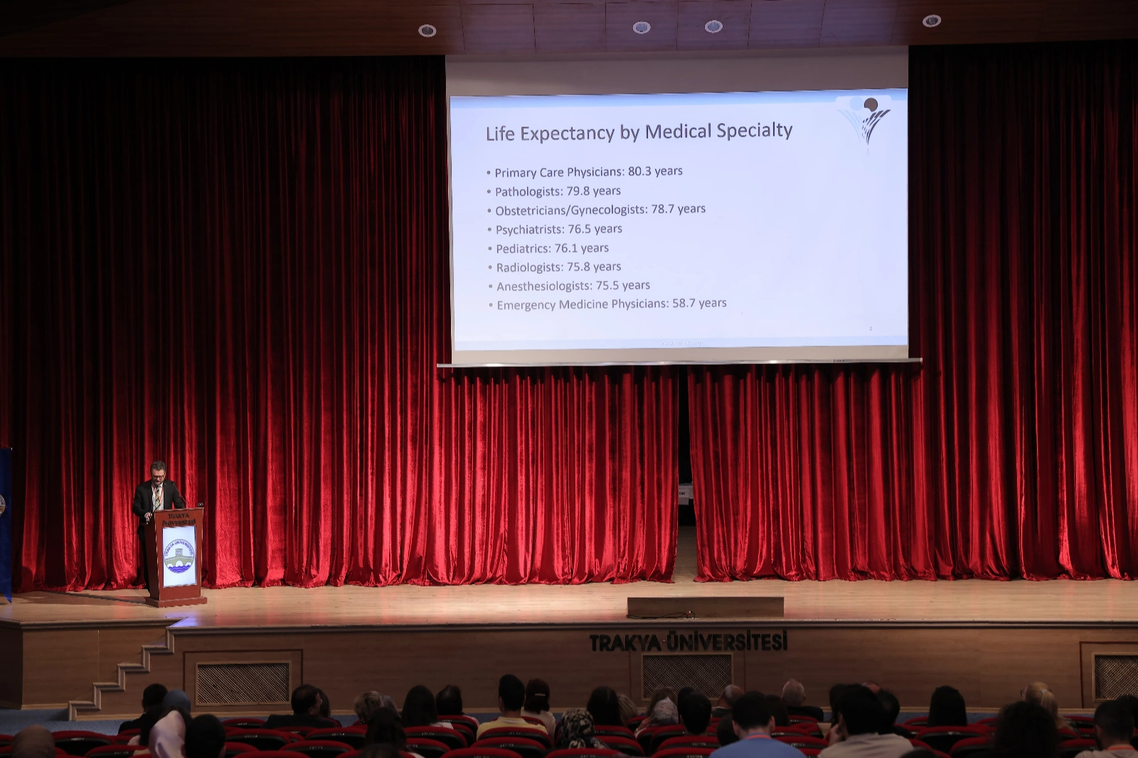 Açılış konuşmalarının ardından Trakya Üniversitesi Tıp Fakültesi Aile Hekimliği Ana Bilim Dalı Öğretim Üyesi Prof. Dr. Serdar Öztora, “Self-care for Health Care” başlıklı sunumunu gerçekleştirdi. Öztora sunumunda, sağlık çalışanlarının yaşam kalitesi ve kendi sağlıklarına yönelik yaklaşımlarını ele aldı.