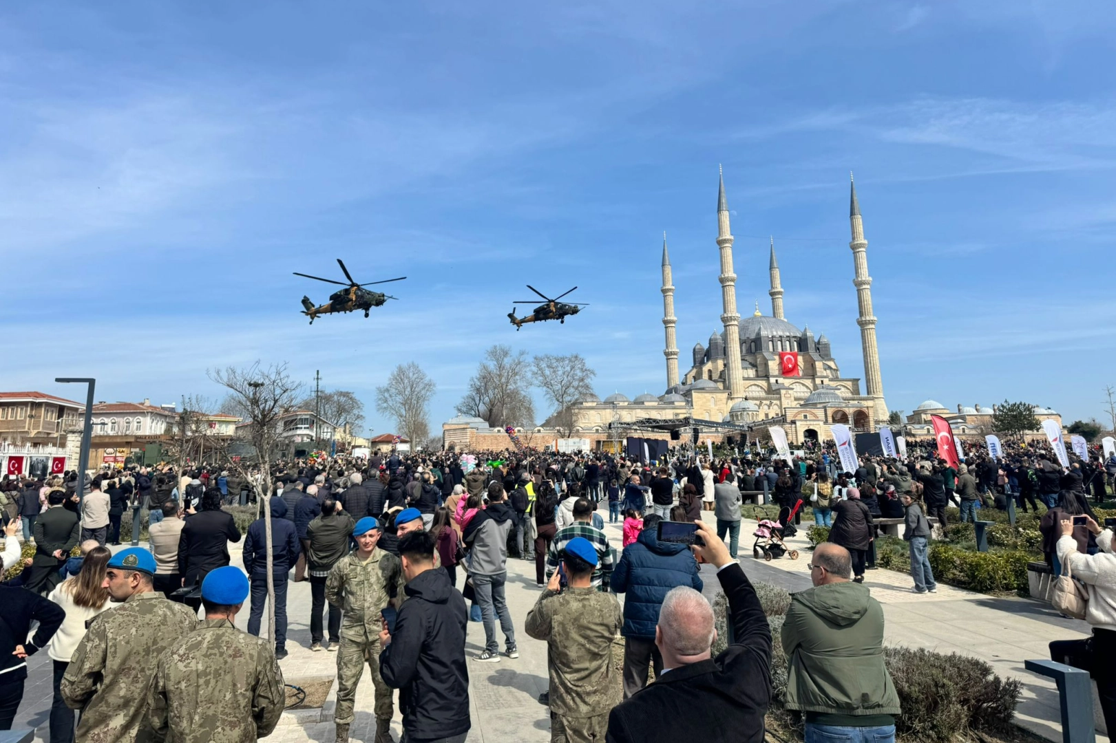 Sabah saatlerinde F-16 ve AKINCI TİHA’ların geçişinin ardından, bu kez sahneye yerli üretim ATAK helikopterleri çıktı. Selimiye Camii’nin eşsiz silüeti etrafında keskin dönüşler ve alçak uçuşlar gerçekleştiren ATAK’lar, Türk Silahlı Kuvvetleri’nin vurucu gücünü bir kez daha gözler önüne serdi. Helikopterlerin motor sesi Selimiye Meydanı’nda yankılanırken, binlerce vatandaş bu tarihi anları gururla takip etti.