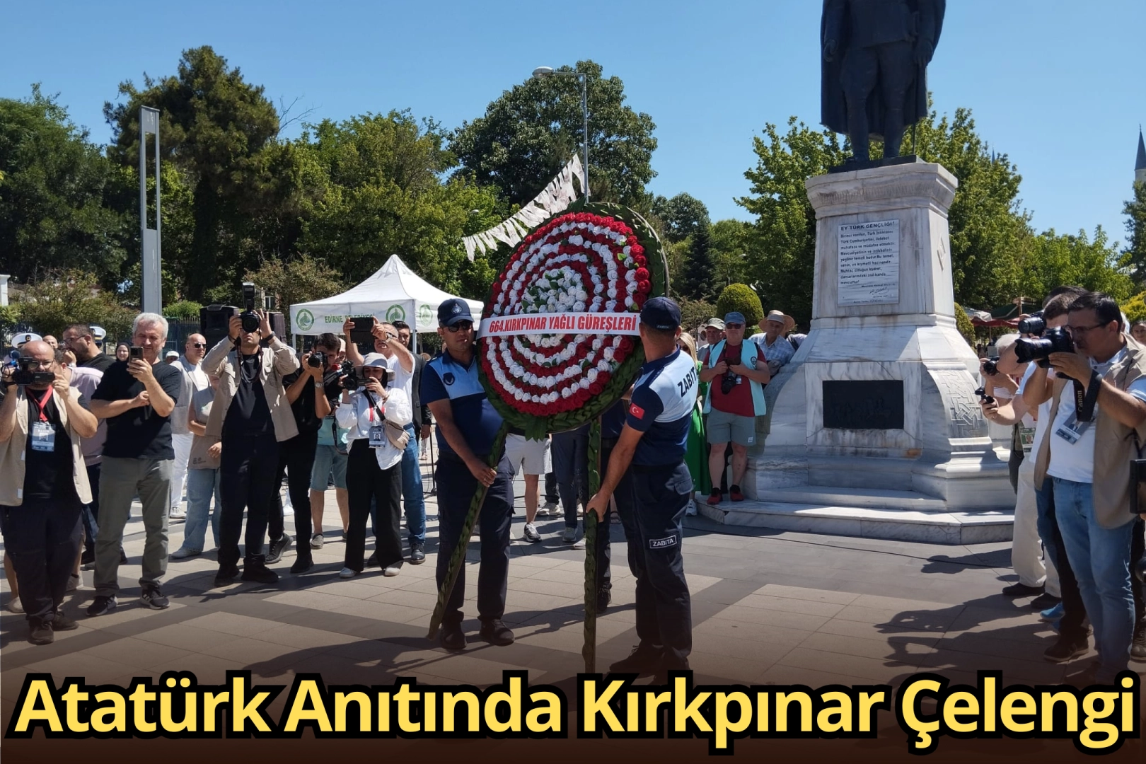 Tarihi Edirne Belediye binasında gerçekleşen ziyaretin ardından altın kemer ve Kırkpınar çelengi eşliğinde oluşturulan kortej, Atatürk anıtına yürüdü. Kırkpınar heyetinin, Atatürk anıtına çelenk sunumu ile devam eden törende, Türkiye Cumhuriyeti’nin kurucusu Mustafa Kemal Atatürk, silah arkadaşları ve tüm şehitler anısına bir dakikalık saygı duruşunda bulunularak, İstiklal Marşı okundu. Törende ayrıca söz ve müziği emekli öğretmen Beyazıt Sansı’ya ait olan Kırkpınar Marşı da Sansı’nın oğlu Seven Sansı ve belediye bandosu tarafından icra edildi.