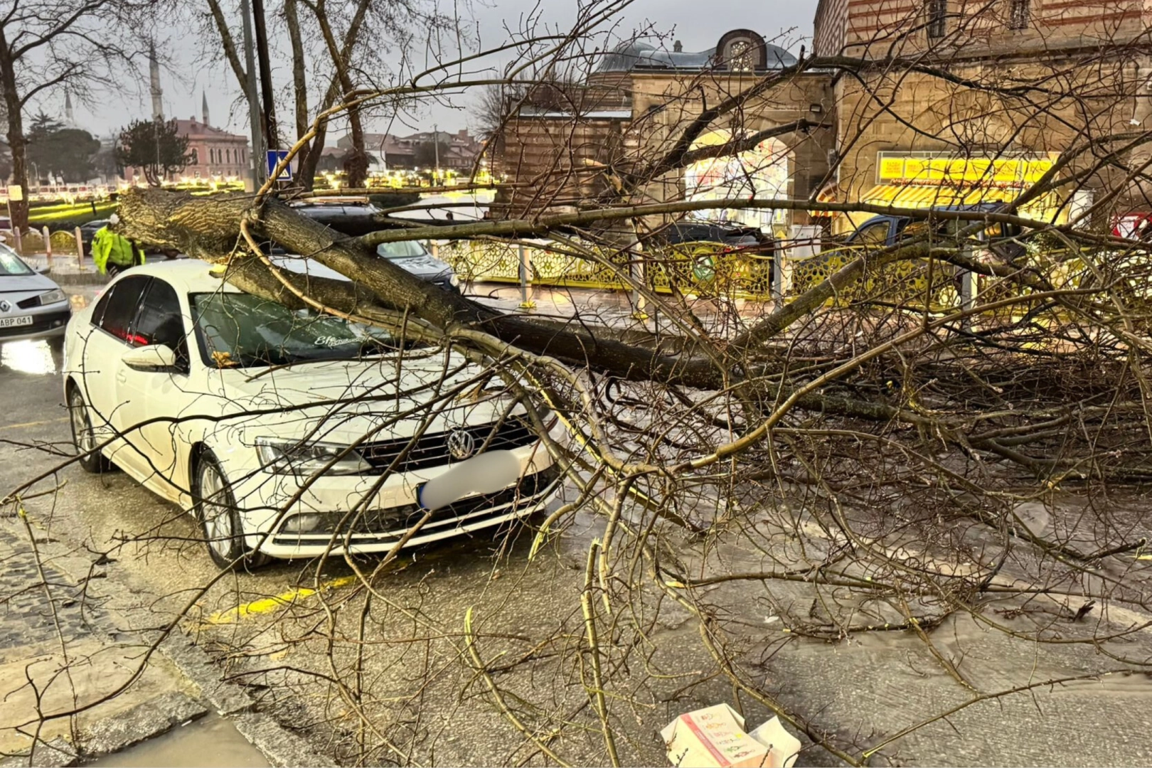 Cadde üzerindeki bir ağaç, yağmur ve fırtınanın etkisine dayanamayarak bir otomobilin üzerine devrildi. Olayda yaralanan olmazken, cadde trafiğe kapandı.