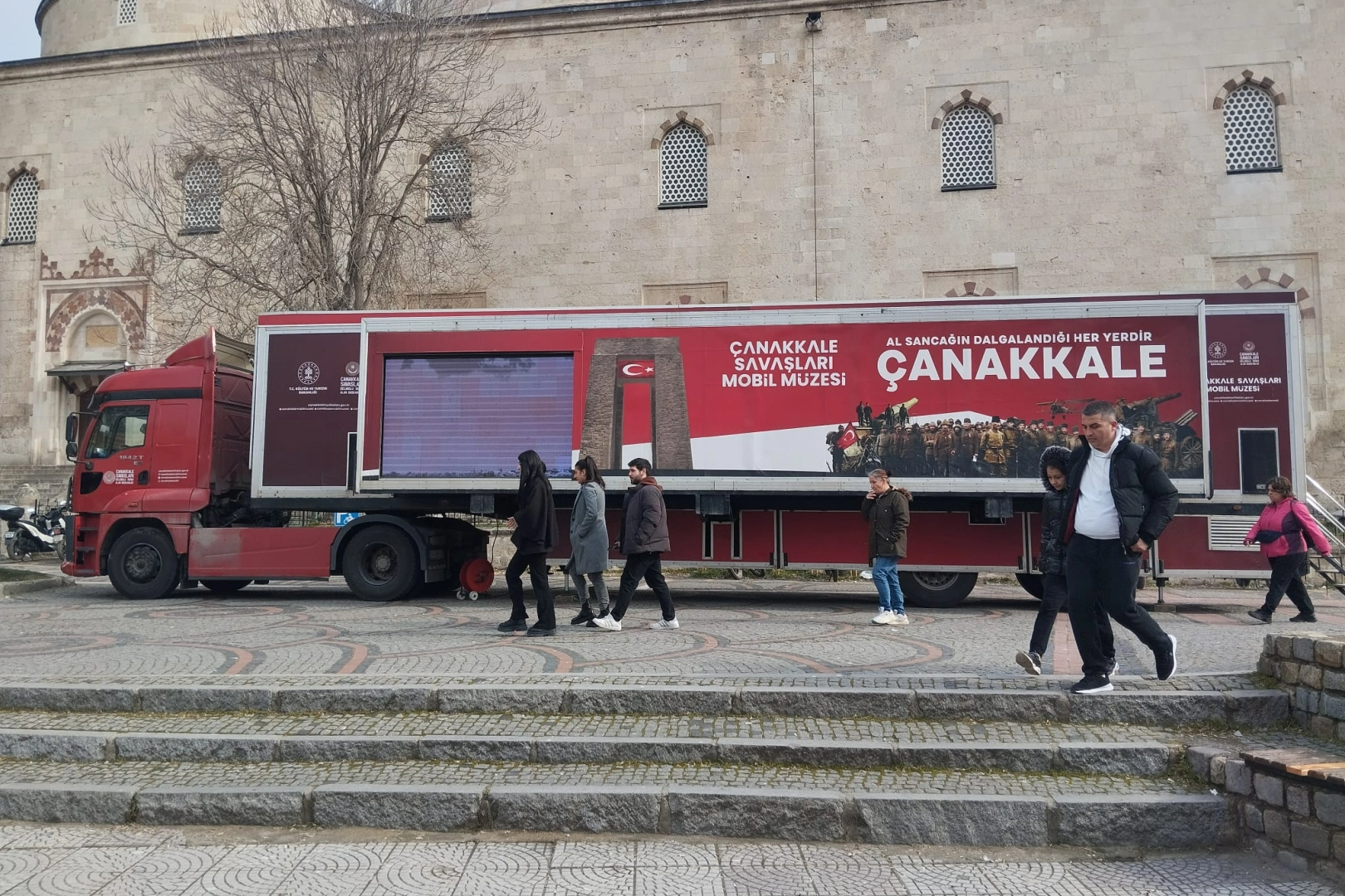 Çanakkale Savaşları Mobil Müzesi Edirne’de. Eski Cami altında kurulan mobil müze, Edirneli vatandaşlar tarafından üç gün boyunca ücretsiz ziyaret edilebilecek. Mobil müzenin 7 ayrı bölümden oluştuğunu belirten Çanakkale Savaşları Mobil Müzesi Teknik Sorumlusu Necmi Can Akyıldız; “Müzemiz 25-26-27 Şubat tarihlerinde sabah 09.00-akşam 17.00 Edirne’de Eski Cami’nin altındaki alanda olacak. Tüm ziyaretçilerimizi bekliyoruz. Müzemizin içerisinde 7 ayrı vitrin var. 1’inci bölüm ‘Vatan bizi çağırıyor’ bölümü, Osmanlı Devleti’nin savaş öncesi halkına ve Müslüman alemine yaptığı çağrıyı anlatıyor. 2’nci bölüm, ‘Göğsümde iman elinde süngü’ vitrininde, askerimizin giymiş olduğu ekipmanlar ve silahlar var. 3’ncü ‘Düşmanı tanı’ vitrininde, düşman askerlerinin bize karşı kullanmış olduğu ekipmanları görüyoruz. Bir sonraki vitrinde ‘Şanlı boğaz zaferi’ anlatılıyor. 5’inci vitrin, ‘Şeref Türklerindir’ vitrininde ise kara cephesini yaşıyoruz. Burada Anafartalar Komutanı Albay Mustafa Kemal’in bal mumu heykeli sergileniyor. 6’nci ‘Cehennemi göğsünde söndürenler’ vitrininde yüreğe dokunan asker mektuplarını ve Osmanlı harp madalyasını görüyoruz. Son vitrinimiz olan ‘Savaştan geriye kalanlar’ vitrininde de savaş alanında bulunmuş olan tarihi eserlerimizi görüyoruz” dedi.