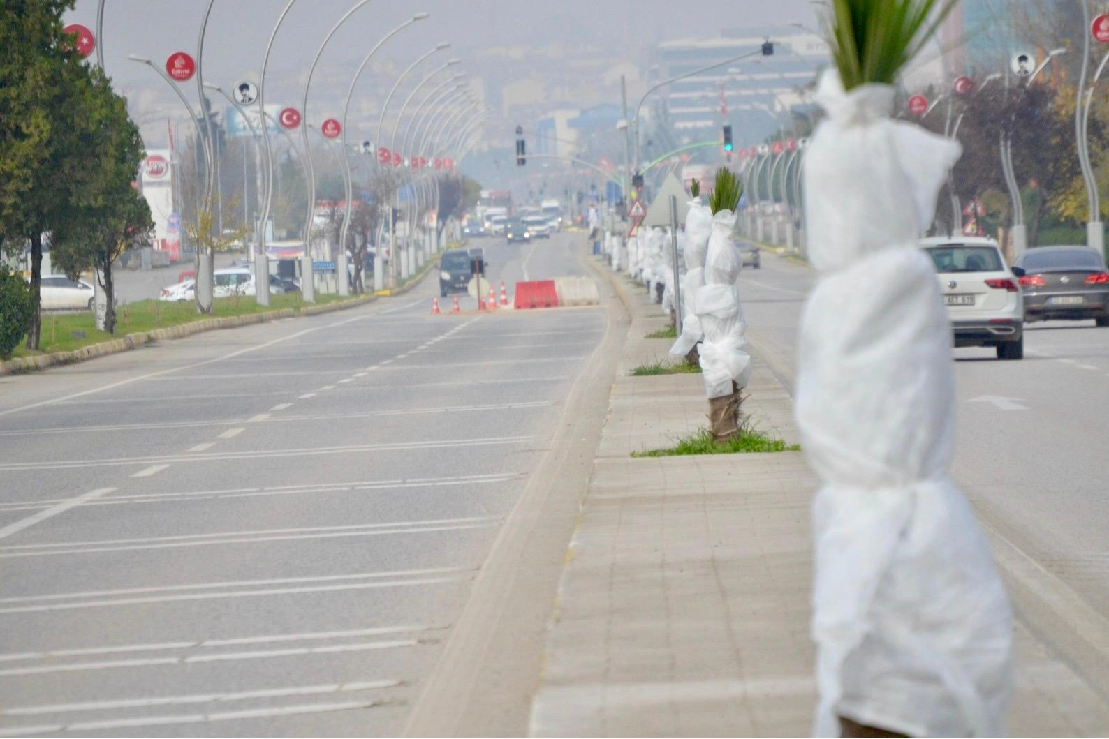 Hava sıcaklıklarının düşmesiyle birlikte, palmiye ağaçlarının üzeri soğuktan korunması amacıyla branda benzeri malzemelerle örtüldü. Yapılan koruma uygulaması, Atatürk Bulvarı’ndan geçen vatandaşların dikkatini çekti.