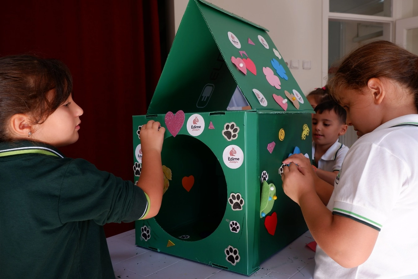 Belediye Yaşam Merkezi’nde gerçekleştirilen etkinlikte, çocuklara eğitmenler tarafından kedi-köpek evi yapımı öğretildi, kedi ve köpeklerin bakımı ile bilgiler verildi. Çocuklar boyadıkları el işlerini hazırlanan kedi-köpek evlerine yapıştırdılar. Ardından kulübeleri rengarenk boyayan çocuklar, eğlenceli anlar yaşadı.