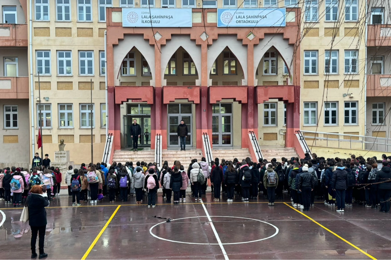 Kahramanmaraş merkezli 6 Şubat 2023 depremlerinde hayatını kaybeden vatandaşlar için felaketin yıl dönümünde Edirne Lala Şahinpaşa İlk ve Ortaokulu'nda saygı duruşu yapıldı.