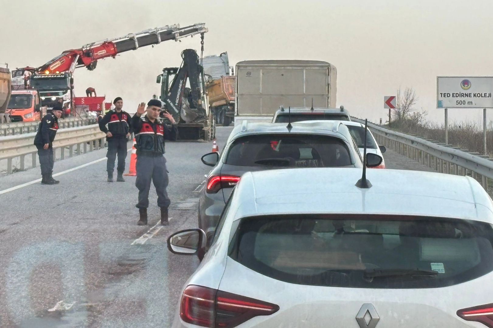 Devrilen kamyonun kaldırılması sürerken jandarma güvenlik önlemi aldı, bölgede uzun araç kuyrukları oluştu. Edirne’de sabah saatlerinde Edirne’den Havsa istikametine seyir halinde olan M. D.’nin kullandığı 42 AJB 0** plakalı kum yüklü kamyon, arıza yapan bir araca çarpmamak için manevra yaptığı sırada kontrolden çıkarak devrilmiş ve sürücü hastaneye kaldırılmıştı.