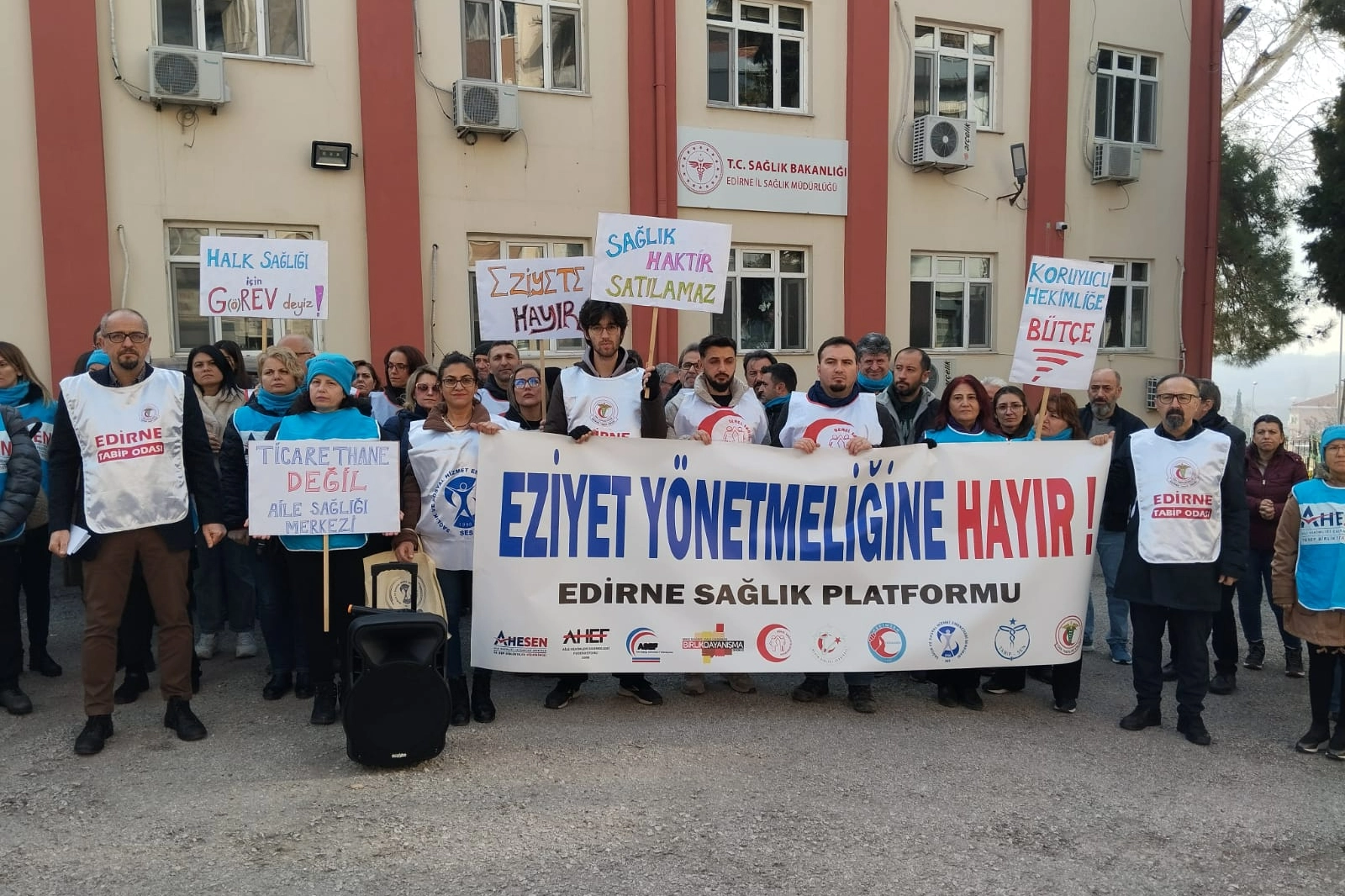Edirne’deki aile hekimleri bugün itibariyle bir hafta süresince ve üçüncü kez iş bırakma eylemine gittiler. İş bırakma eylemi yapan aile hekimleri, Edirne İl Sağlık Müdürlüğü önünde basın açıklaması yaptılar.