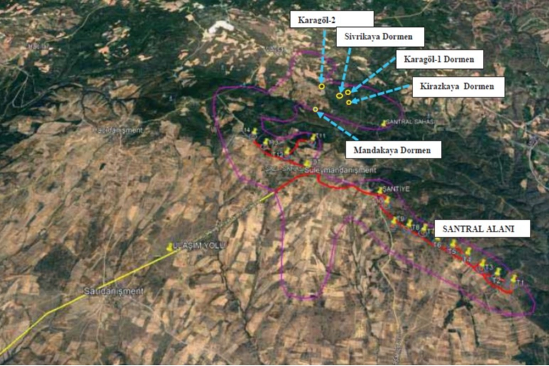 SANTRAL SAHASI İÇİN DOLMENLER TESPİT EDİLMİŞDosyada dikkat çeken bir diğer konu ise projenin santral sahası içinde, Mandakayalar 1. derece arkeolojik sit alanı olarak tescilli Dolmeni, Karagöl 1 ve 2 Dolmeni, Kirazkaya Dolmeni ve Lahit ile Sivrikaya Dolmeninin olduğu Edirne Kültür Varlıklarını Koruma Bölge Kurulu Müdürlüğünce tespit edilmesi oldu. Söz konusu tescilli taşınmazların koordinatlı sınırları içerisinde herhangi bir inşai ve fiziki uygulama yapılmayacağı dosyada belirtildi.